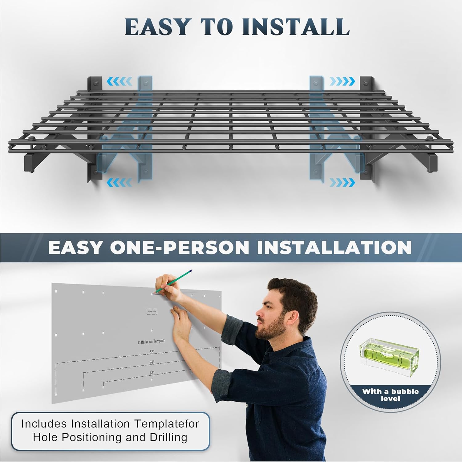 - 🏆【Heavy-Duty Load Capacity】- Jusgym garage shelving wall mounted system is engineered with premium steel, offering exceptional strength. Each 2x3ft bracket holds up to 250 lbs, and with 4 shelves totaling 1000lbs capacity, it effortlessly stores bulky items like tools, tires, and heavy storage bins. Built to last, even under extreme weight!