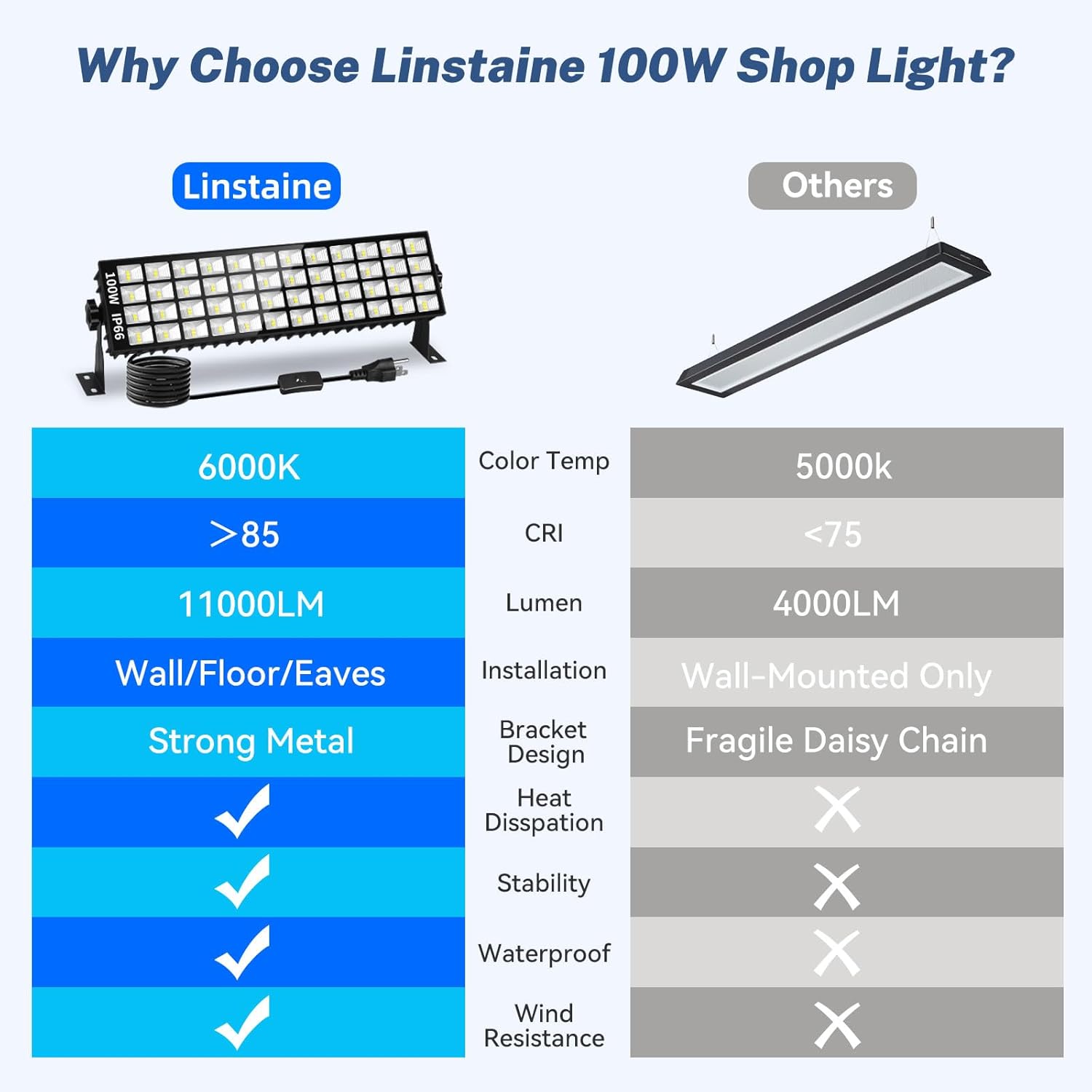 - 100W Exceptional Brightness and Energy Efficient: With 100pcs LED energy-saving chips, the shop lights deliver incredible brightness of 11000 lumens at a 6000K daylight color temperature while saving over 85% on energy costs