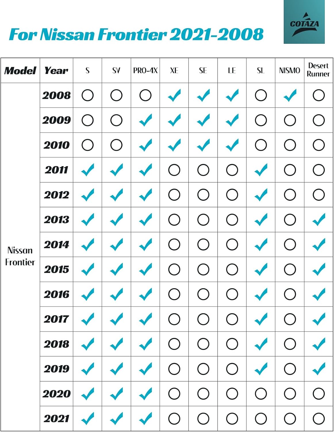 - Comprehensive Coverage: COTAZA custom car floor mats for Nissan Frontier 2008-2021 fits your entire car carpet with no gaps. These rubber car floor mats lay flat as if original to the interior, covering where you rest your left foot. By ensuring ample pedal clearance, locking into the two driver's side buckles on floor carpet, and featuring a high-traction underside, our non slip car floor mats rubber provide stability during braking or sharp turns in all weather. Trim-to-fit carpet protector mat can't match