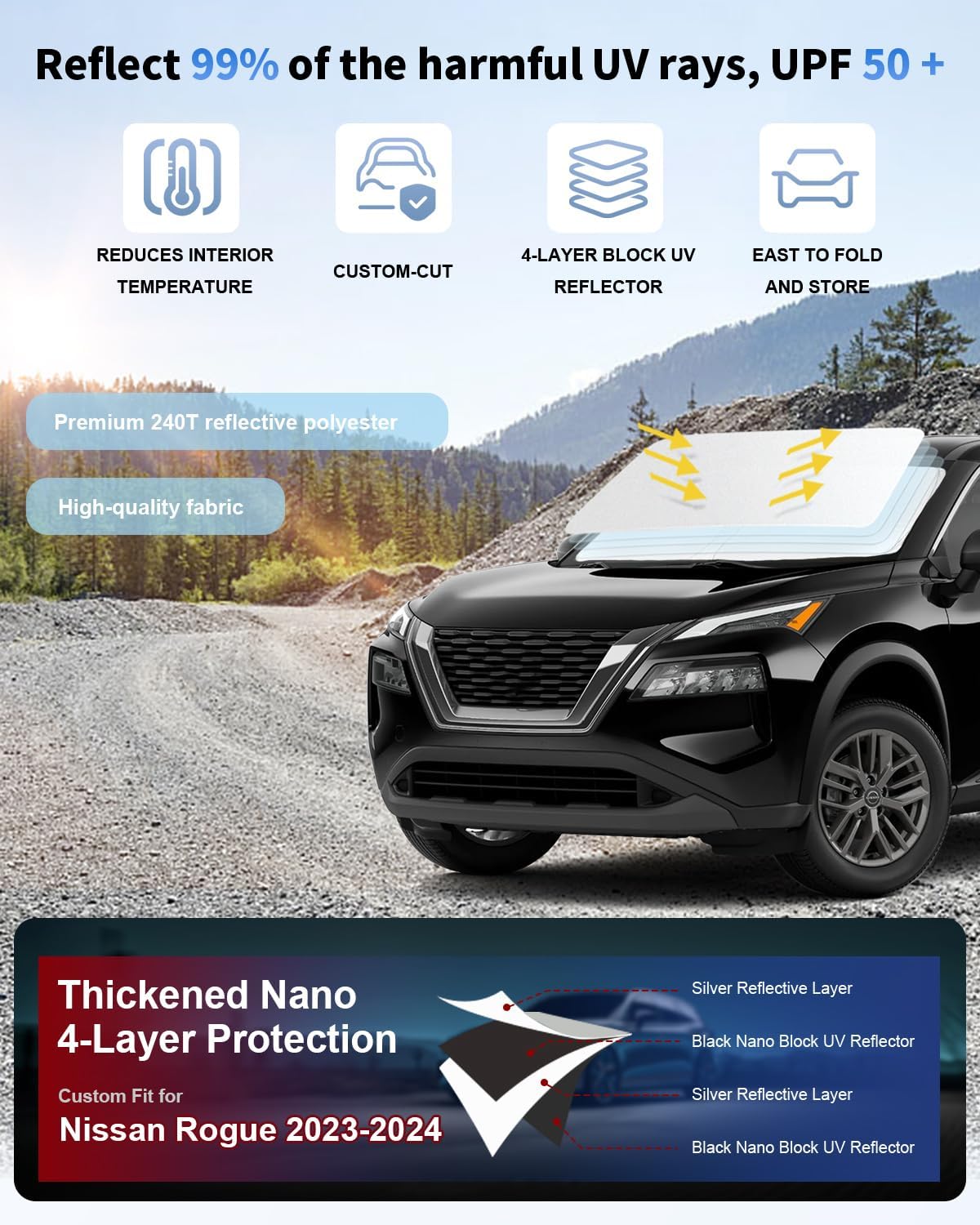 for Nissan Rogue Windshield Sun Shade Sunshade Custom Fit Rogue Accessories 2023-2024 2025 (Not for Rogue Sport) 2-Layer Windshield Cover Front Window Sun Visor 240T Shield Protector Block UV Ray