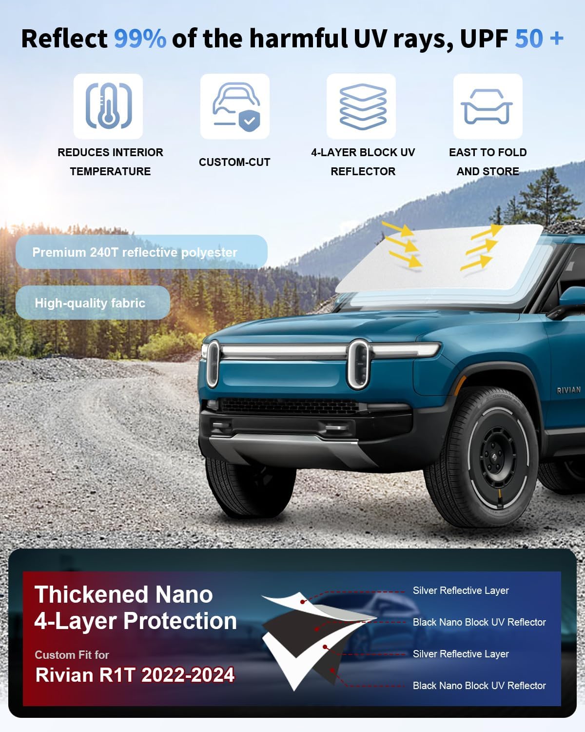 Sunshade for Rivian R1T Windshield Sun Shade Custom Fit for 2022 2023 2024 2025 Rivian R1T Truck Accessories Windshield Cover, 4-Layer Car Front Window Sun Visor Shield Foldable Protector Block UV Ray