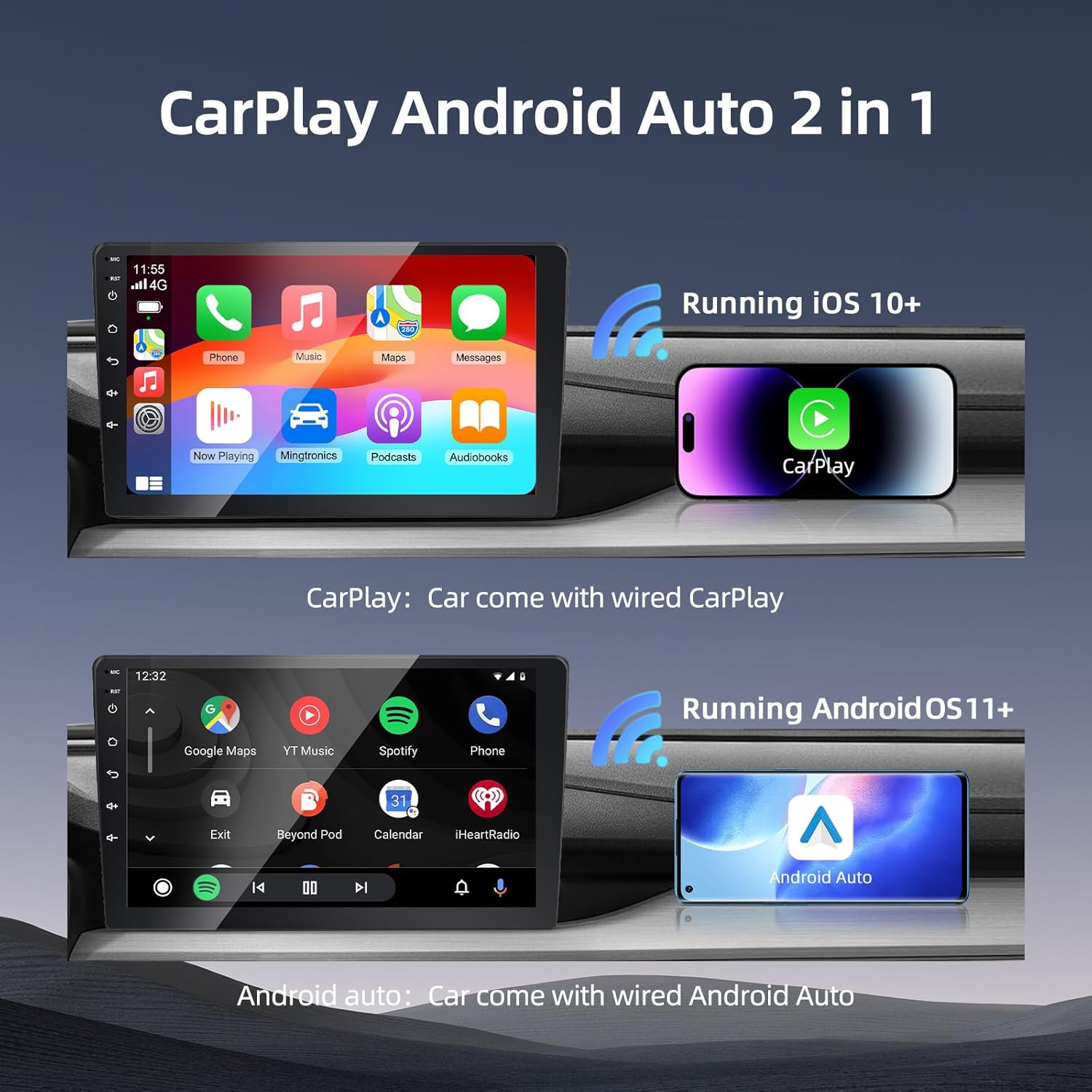 - 【Before You Buy】: Requires iPhone (iOS 10+) or Android phone (OS 11+). Your car must have factory wired CarPlay for wireless CarPlay feature, factory wired Android Auto for wireless Android Auto feature. Note: Not compatible with BMW & Tesla