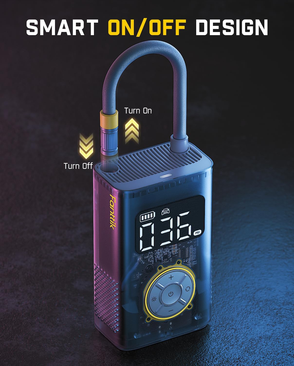 - Safe and Energy Conserving: no more fussing with hose installations on the X9 Pro! All you need to do is pull out the yellow end of the hose to activate it and simply push it back into the inflator’s body to turn it off; What’s more, if left unused for 3 mins, it will automatically shut down, preventing accidental activations, and ensuring a safer user experience
