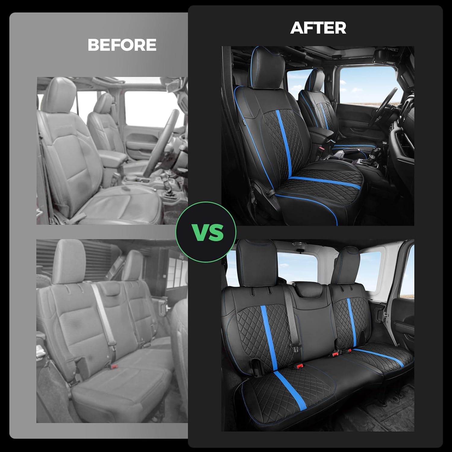 for Jeep Wrangler Seat Covers 4Door JL 2018 2019 2020 2021 2022 2023 2024 2025, Custom Car Seat Cover Full Set, Luxury Waterproof Leather Seat Protectors, Black Blue Trim, W/O Rear Cup Holder