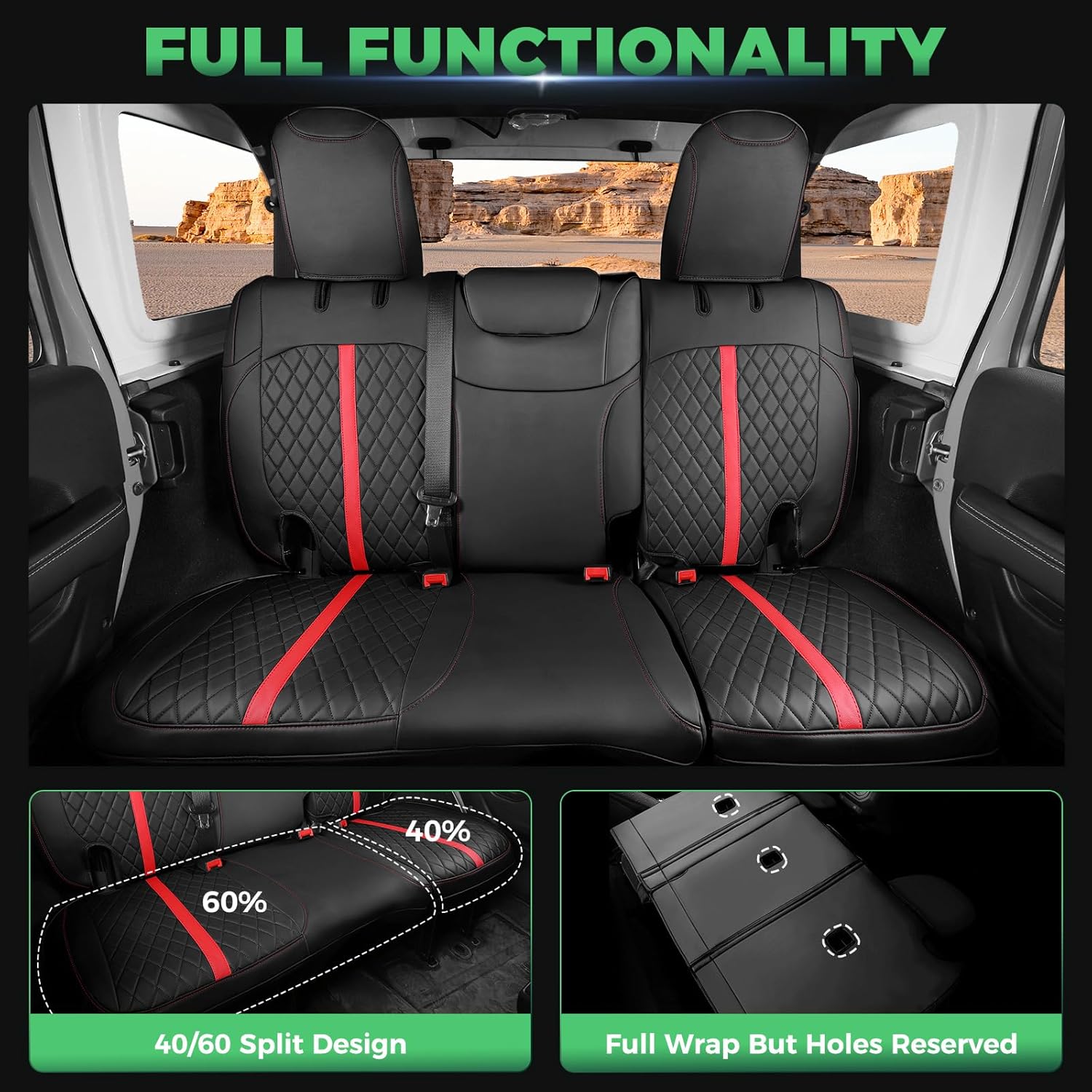 for Jeep Wrangler Seat Covers 4Door JL 2018 2019 2020 2021 2022 2023 2024 2025, Custom Car Seat Cover Full Set, Luxury Waterproof Leather Seat Protectors, Black Red Trim, W/O Rear Cup Holder