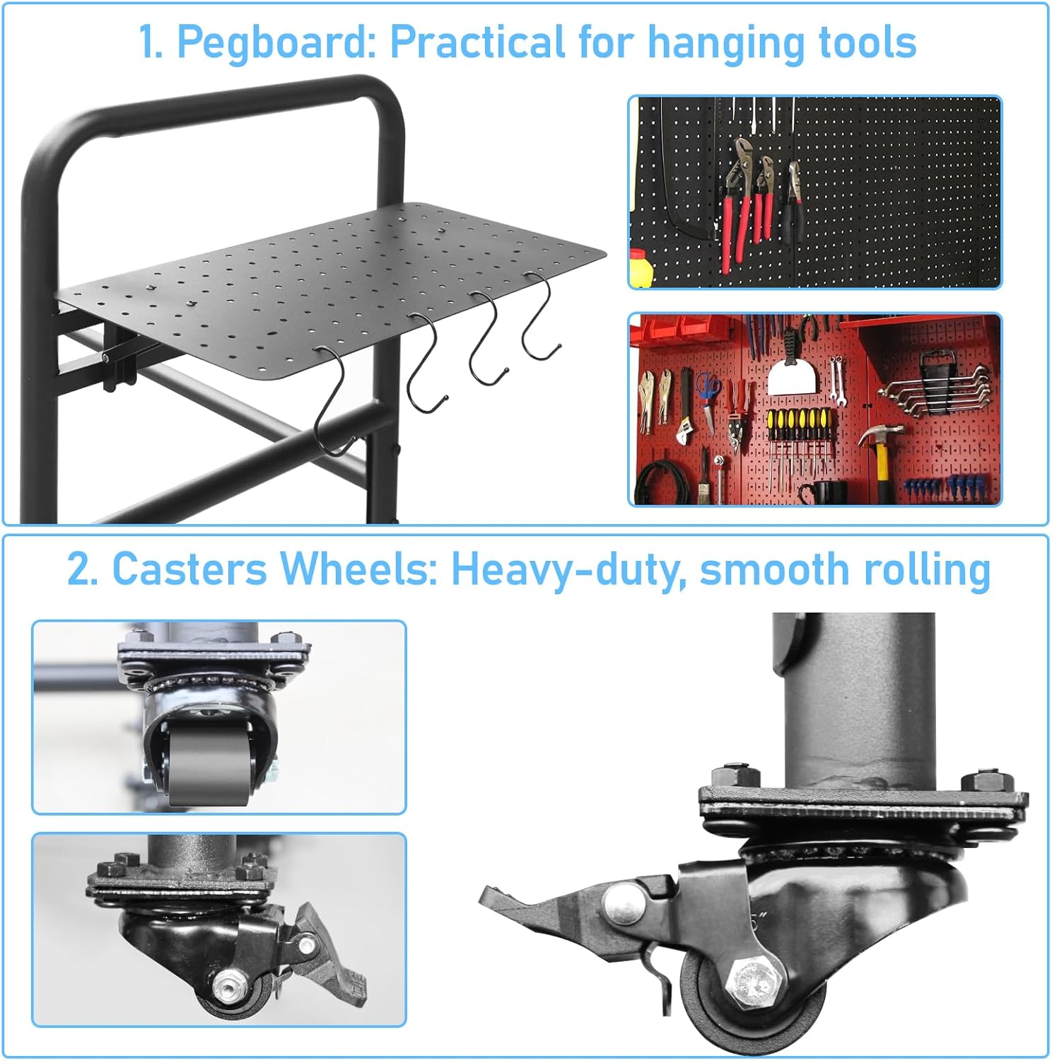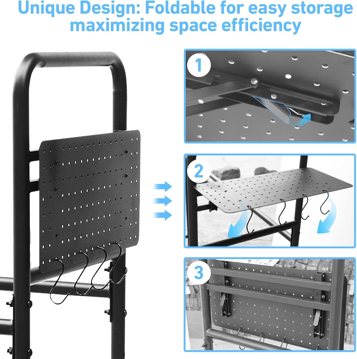 - Innovative Foldable Tool Board: The integrated foldable tool board keeps essential tools—wrenches,pliers,screwdrivers—neatly organized and easily accessible.No more hunting through drawers or rummaging through boxes.Simply fold it away when not in use to maintain a tidy garage environment.Convenience and practicality at its finest