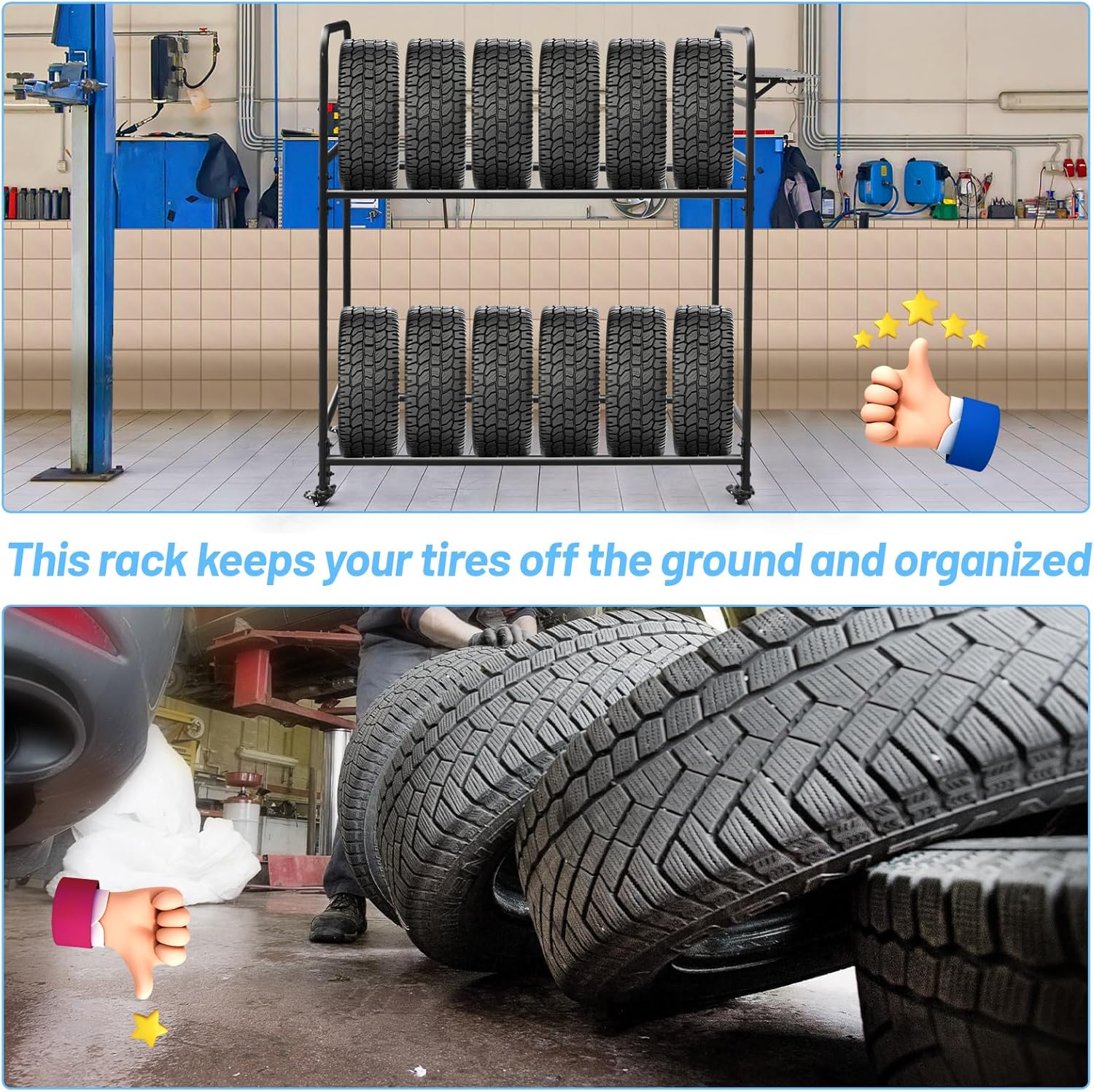 - Effortless Mobility: Equipped with self-locking swivel casters, maneuvering this tire storage rack around your garage is a breeze.Reposition it for cleaning or move it out of the way with ease.These casters ensure smooth,hassle-free movement