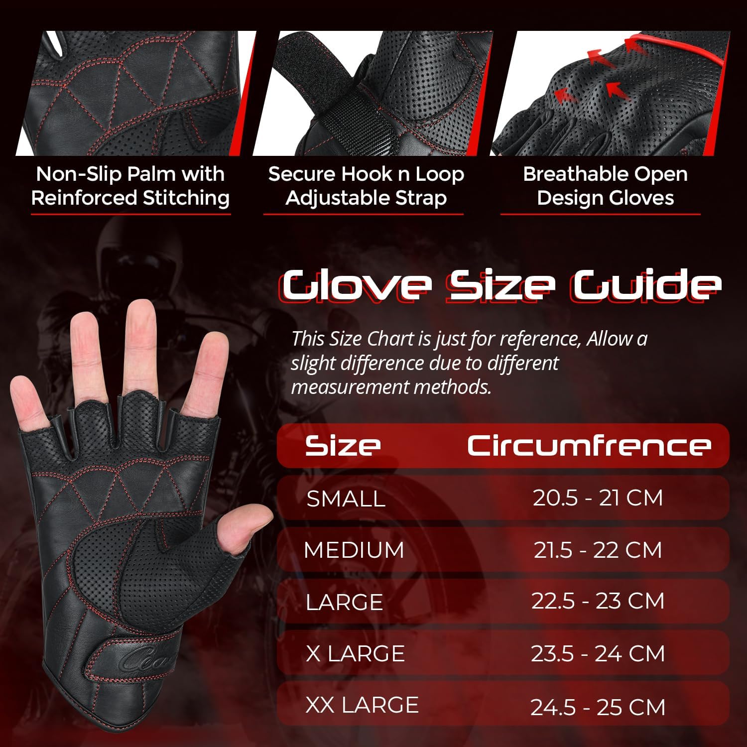 - CHOOSE THE RIGHT SIZE - Our Men's Motorcycle Gloves Offers Five sizes, the Motorbike Gloves offer the perfect fit for men and women. Check our size chart and find the right size for your hands