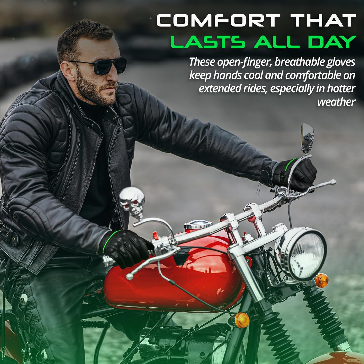 - LEATHER MOTORCYCLE GLOVES - aaasportx black green Motorcycle Gloves are made of premium quality Genuine Leather. Our Lightweight Motorcycle Gloves ensures durability through a variety of situations. aaasportx Motorcycle Gloves for Men offer a high-quality, stylish, and durable finish that excludes sophistication and toughness on the road.