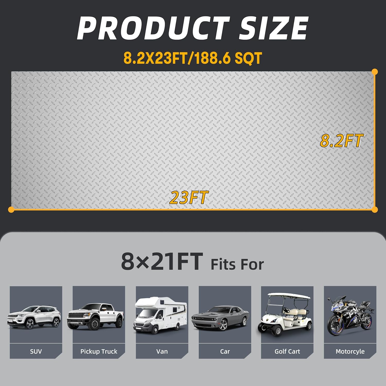 - 【8.2 x 23 FT/188.6 SQFT Garage Floor Mat】: LulnCush garage floor mat measures 8.2 x 23 FT/ 98.4 in x 276 in, this mat covers up to 188.6 SQFT. It is perfect for RV trailer, full size SUVs, MPVs, pickup trucks, golf carts, providing ample coverage and protection for your garage floor.