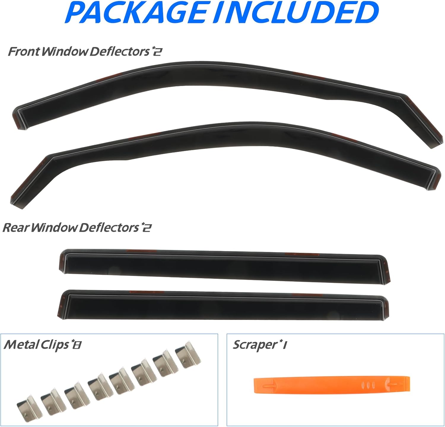 - 【In Channel Design】 CHYKORLA Window vent visors install in the window channel, provides perfect fit and sleek look for your car. Come with 4 pcs FULL-SIZE side window deflectors, 8 pcs clips, 1 pcs plastic Crowbar for a durable and secure installation. No complicated instructions are needed. Attention: Please apply the clip to fix the rain guards