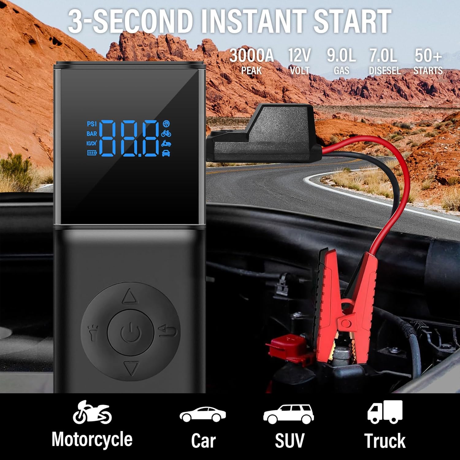 - 🔌【All-in-One Power Station】Portable jump starter with air compressor combines 4-IN-1 functions: car emergency start, tire inflation, power bank, and flashlight.It supports 4 optional units (PSI, BAR, KG/CM²) and 5 adjustment modes (Cars, Motorcycles, Bicycles, Basketball, Pressure Protection). With unique turbocharged capability of 35L/Min (150 PSI), it can quickly inflate a car tire to 20 PSI in just 2 minutes, and also will automatically stop when fully inflated.