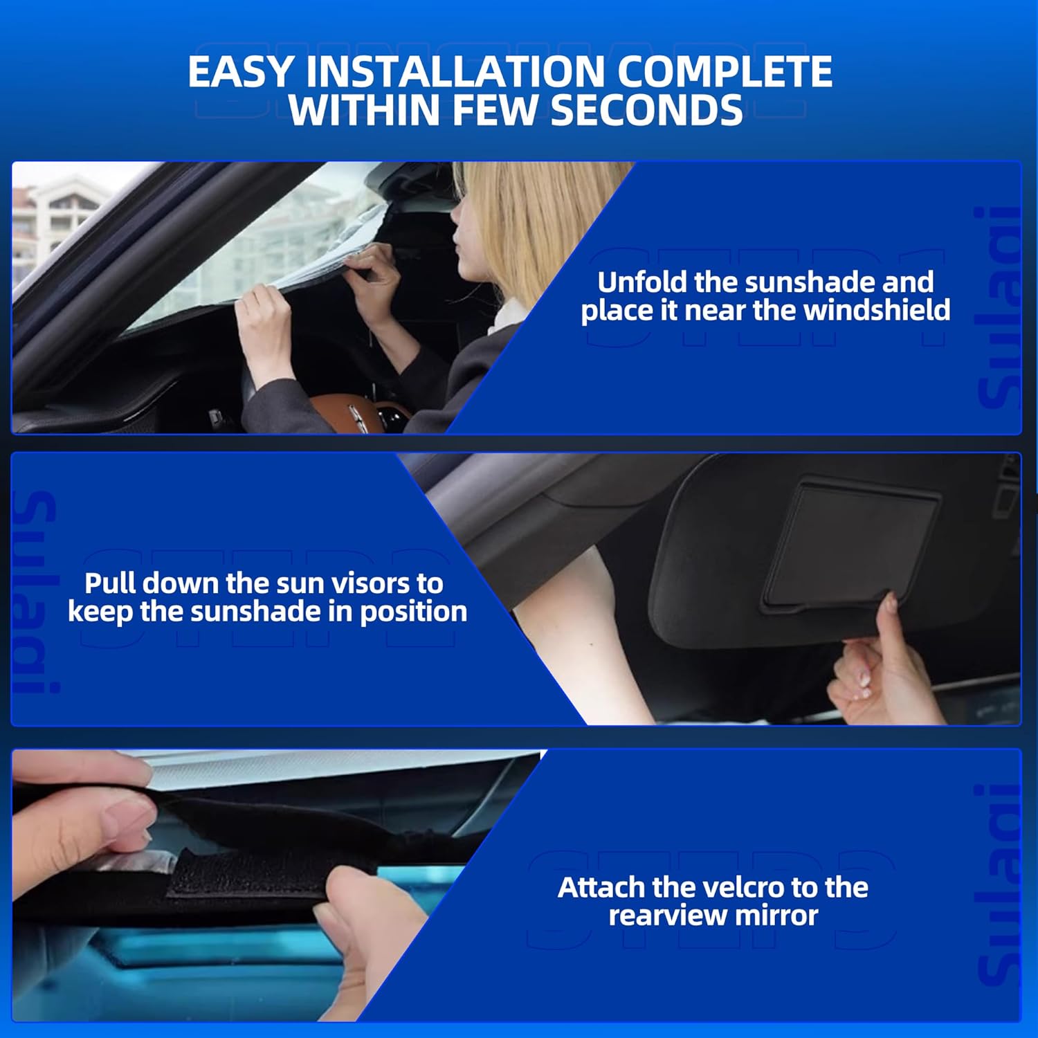 - 𝐏𝐫𝐞𝐦𝐢𝐮𝐦 𝟐𝟏𝟎𝐓 𝐑𝐞𝐟𝐥𝐞𝐜𝐭𝐢𝐯𝐞 𝐅𝐚𝐛𝐫𝐢𝐜: Sulagi car front windshield sun shade is made of high quality 238T polyester fabric materials, durable and eco-friendly, tear-resistant and wear-resistant. Providing long-term use and is less prone to damage for your windshield