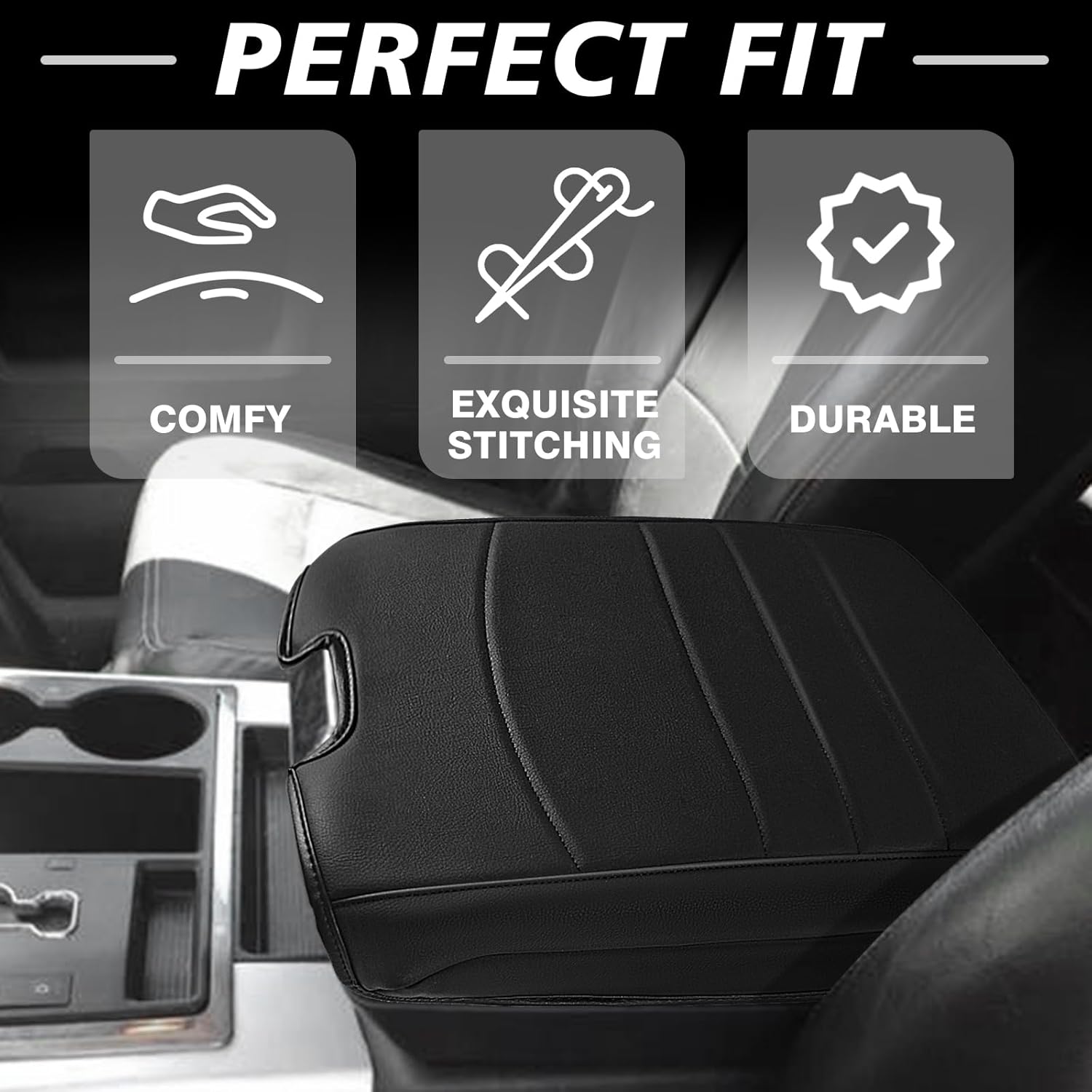 Muslogy Center Console Armrest Cover Compatible with Dodge Ram1500/2500/3500 2013-2018 Comfort Armrest Pad Arm Rest Cushion Vegan Leather Protector Regular Thick(Bucket Seat ONLY)