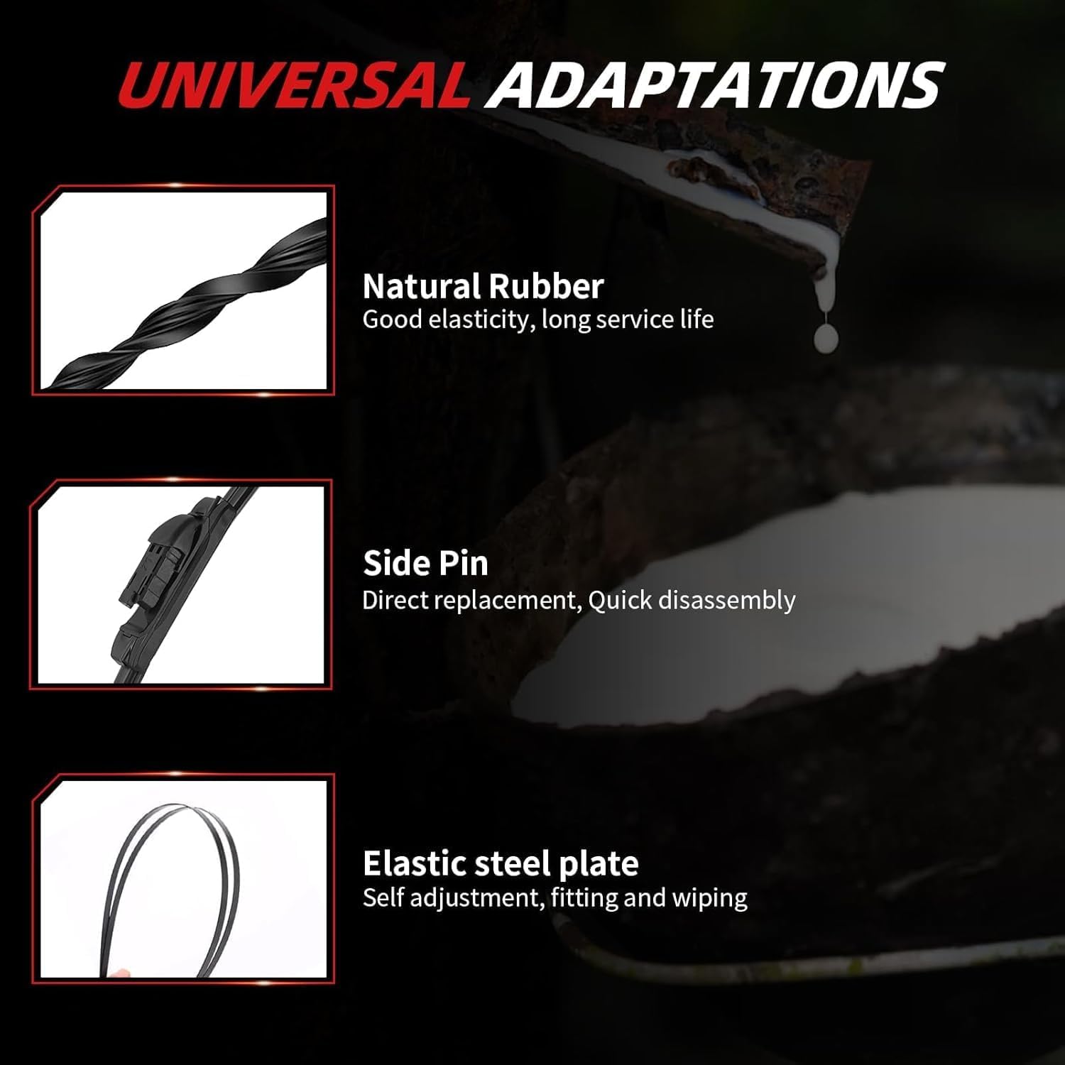 - [Crystal Clear Visibility]: Enjoy a crystal clear view of the road ahead. These windshield wiper blades are crafted to efficiently wipe away debris, water, and snow, providing consistently clear visibility for a safer driving experience