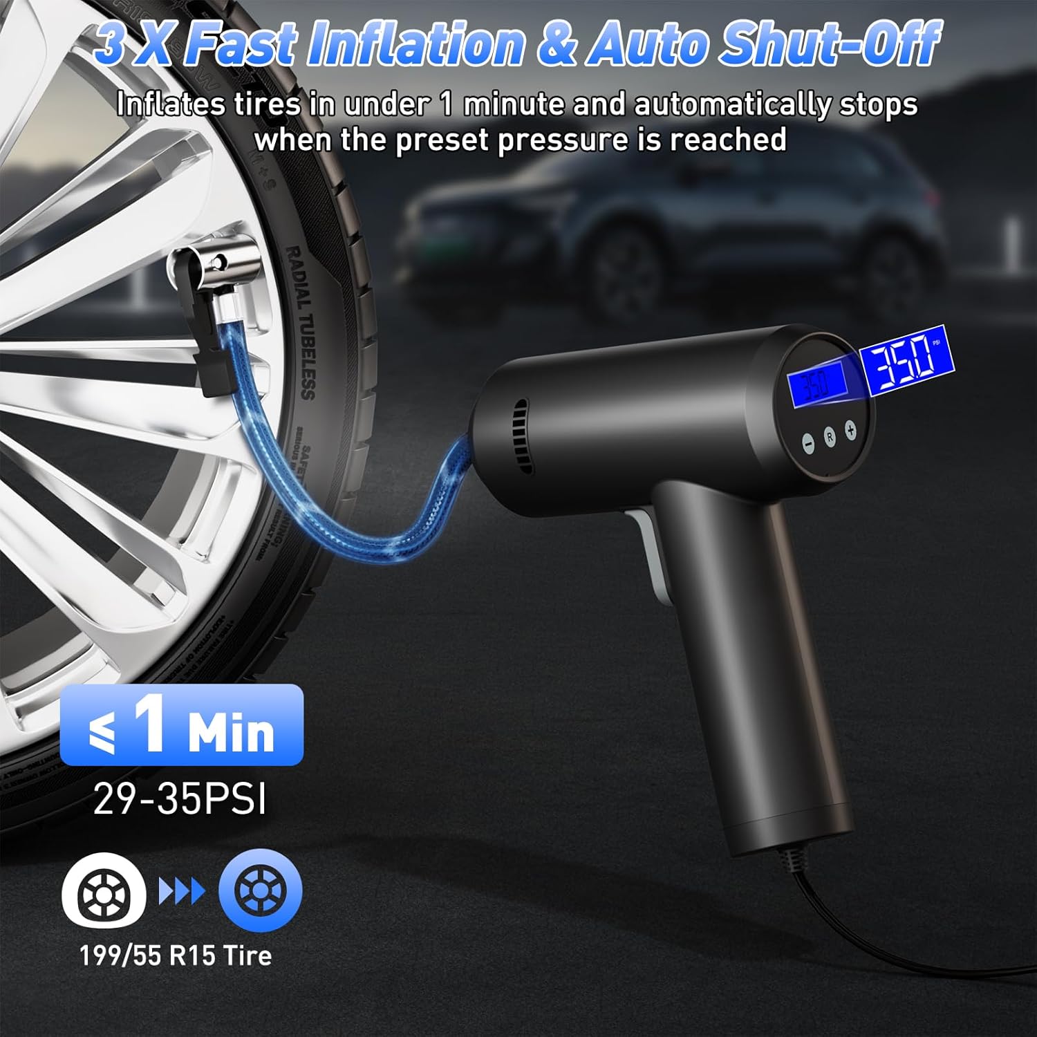 - 【Compact & Travel-Friendly】Designed for convenience, this lightweight and compact air compressor easily fits in your car trunk, glove box, or under the seat. Keep it handy for road trips, long drives, or unexpected tire emergencies. A must-have car accessory for any vehicle owner!