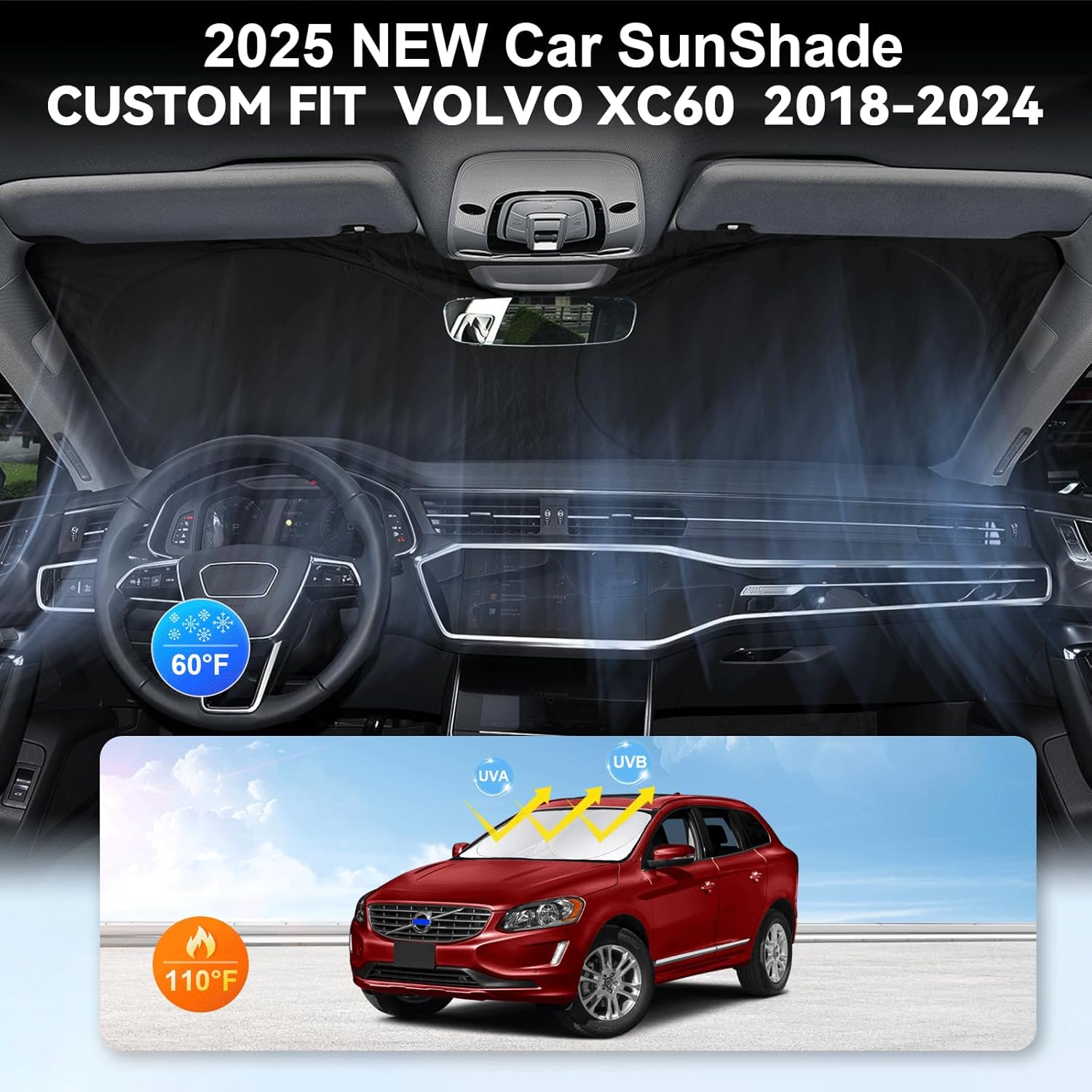 - [CUSTOM-FIT FRONT WINDSHIELD SUNSHADE] Automotive windshield sun shade is Specifically designed,which for 2018 2019-2024 2025 2026 Volvo XC60 SUV Accessories. We have several size of car sunshade. Please measure your car size and refer to our size before your purchase. Once installed it won't have gaps, sags or slumps like other car sun shade windshield