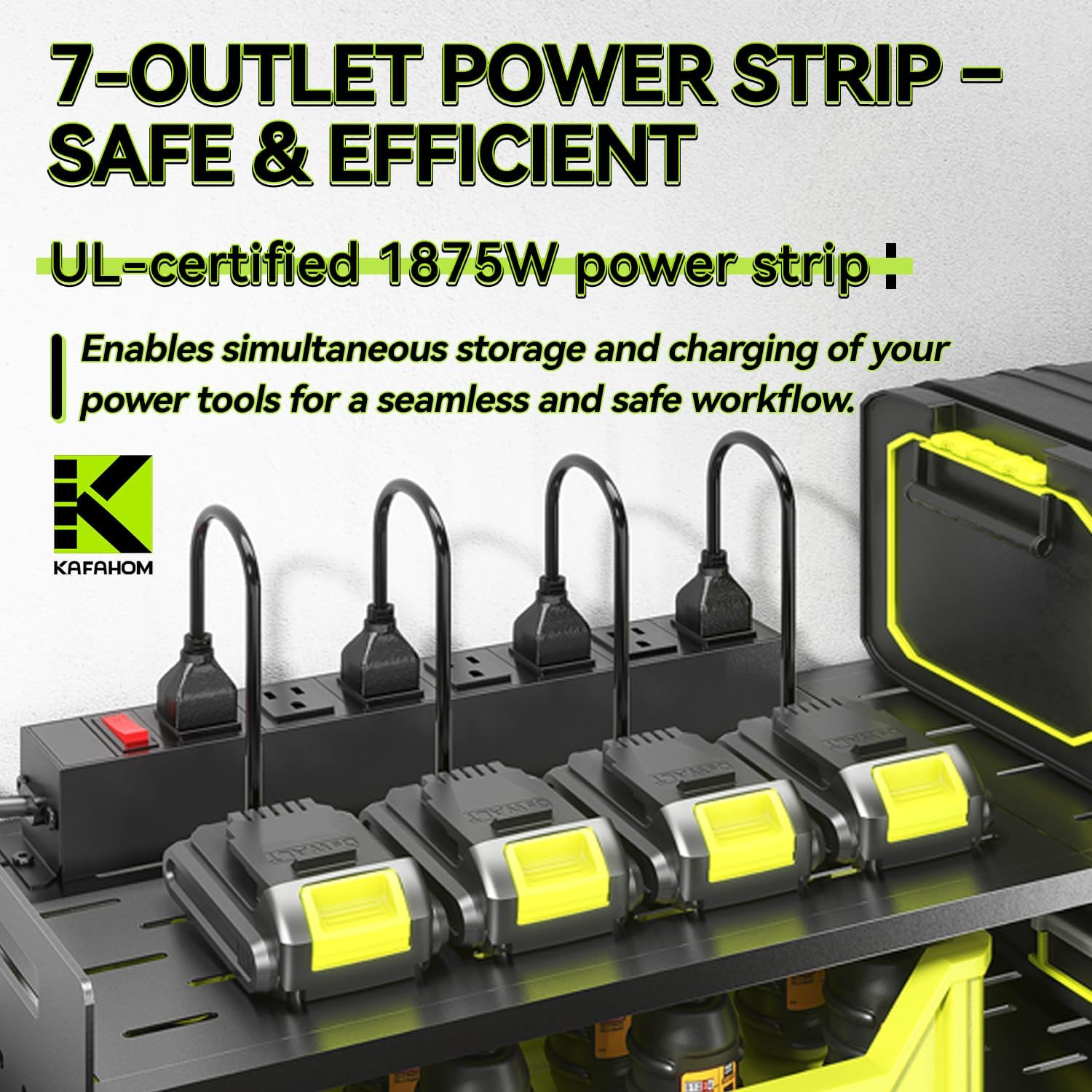 - 7 AC Outlets Charging Station: This tool organizer for garage doubles as a charging hub with 7 AC outlets, ideal for powering up batteries and tools. Output: 125V/15A/1875W. The 6.56-foot power cord with 14AWG wire ensures extra safety and flexibility. Position the power strip on either side to fit your setup.