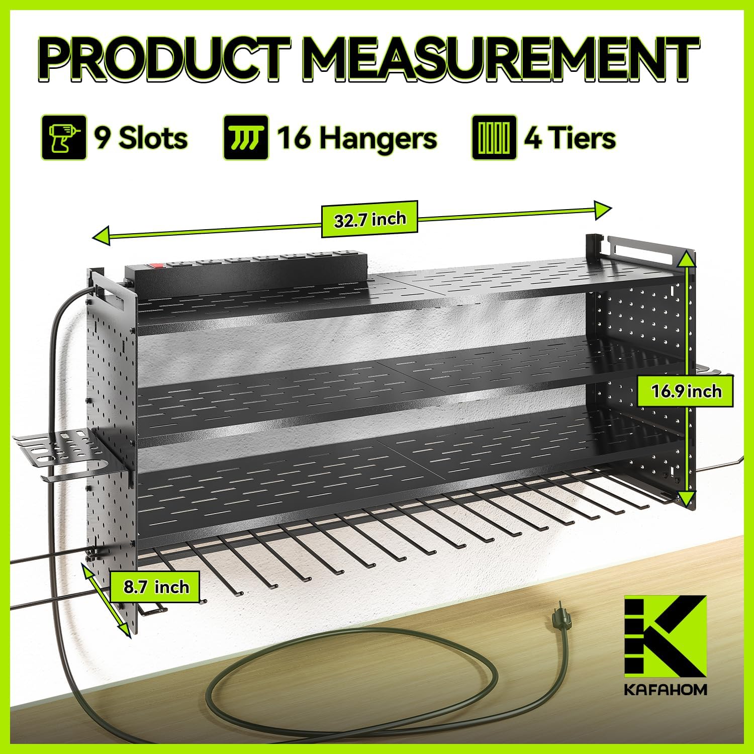 KAFAHOM Power Tool Organizer with Charging Station,9 Drill Holder Wall Mount,4 Layer Durable Metal Cordless Drill Storage for Garage Organization,Battery Tool Rack Built in 7 Outlet Power Strip Black