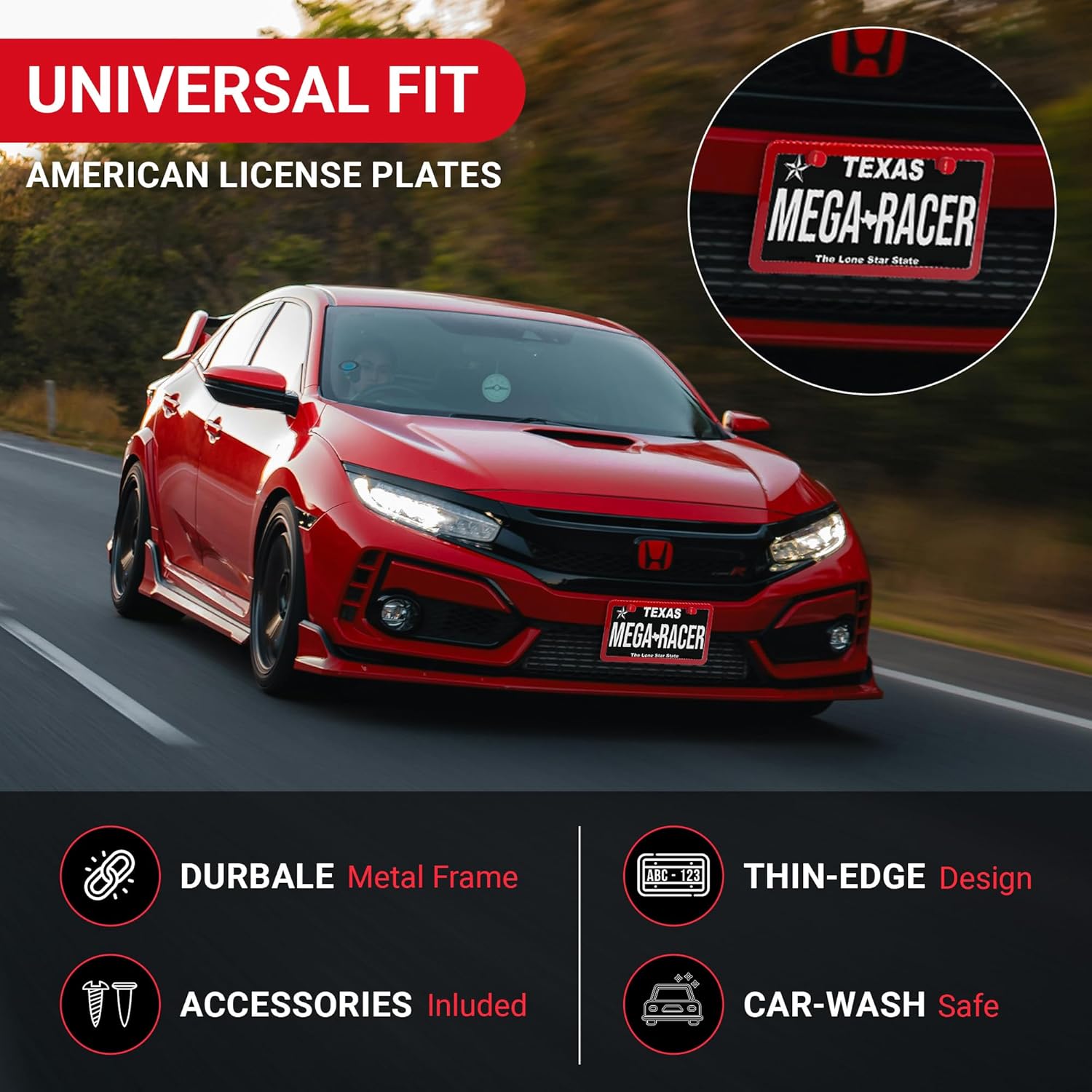 - STRONG DURABLE QUALITY: Our 1 pc License Plate Frame Red Holder is made strong to uphold anything from car washes to weather changes. Mega Racer's red license plate frames are RATTLE PROOF and RUST RESISTANT keeping your vehicle paint SCRATCH FREE.