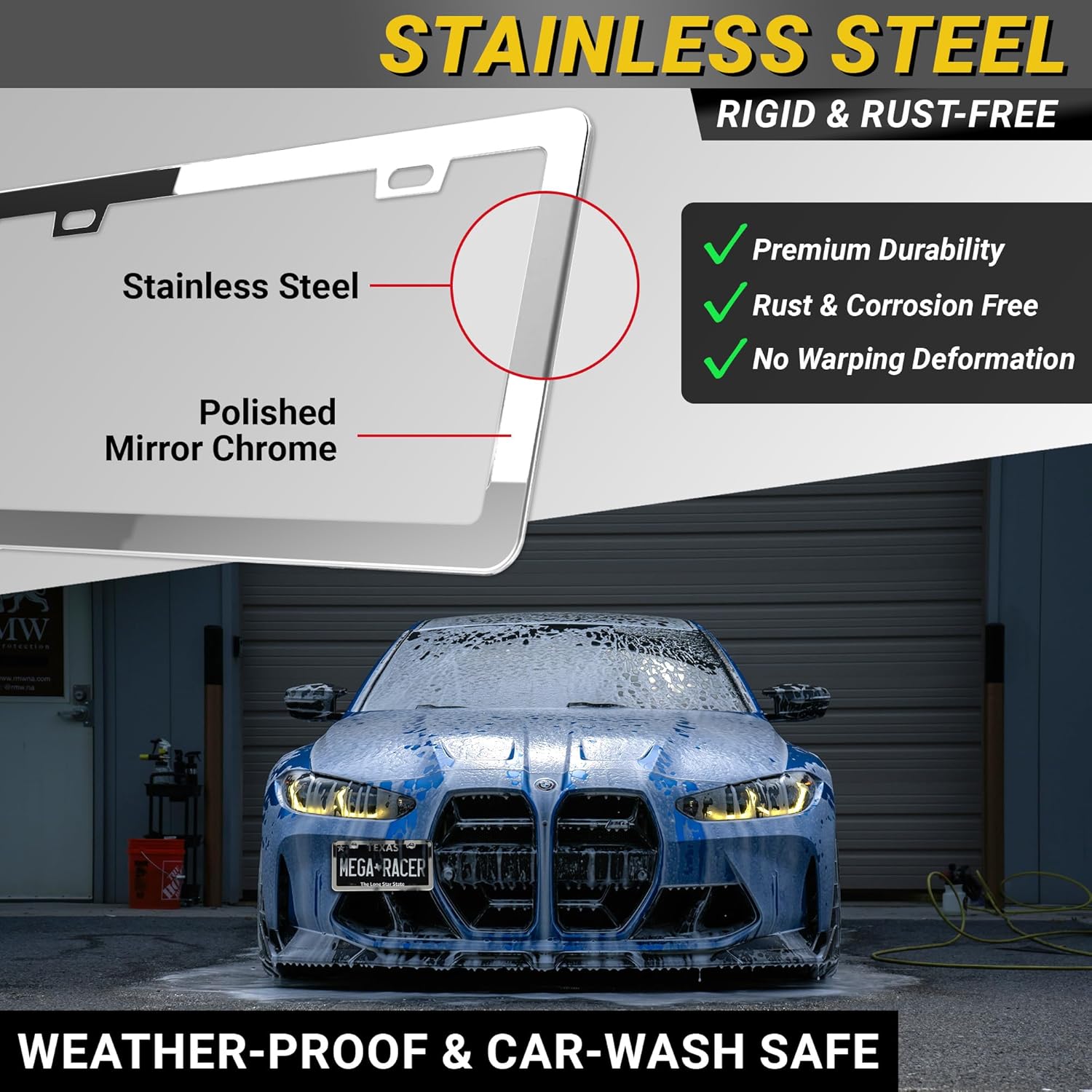 - STRONG DURABLE QUALITY: Our 2 pc License Plate Frame Chrome Holder is made strong to uphold anything from car washes to weather changes. Mega Racer's chrome license plate frames are RATTLE PROOF and RUST RESISTANT keeping your vehicle paint SCRATCH FREE.