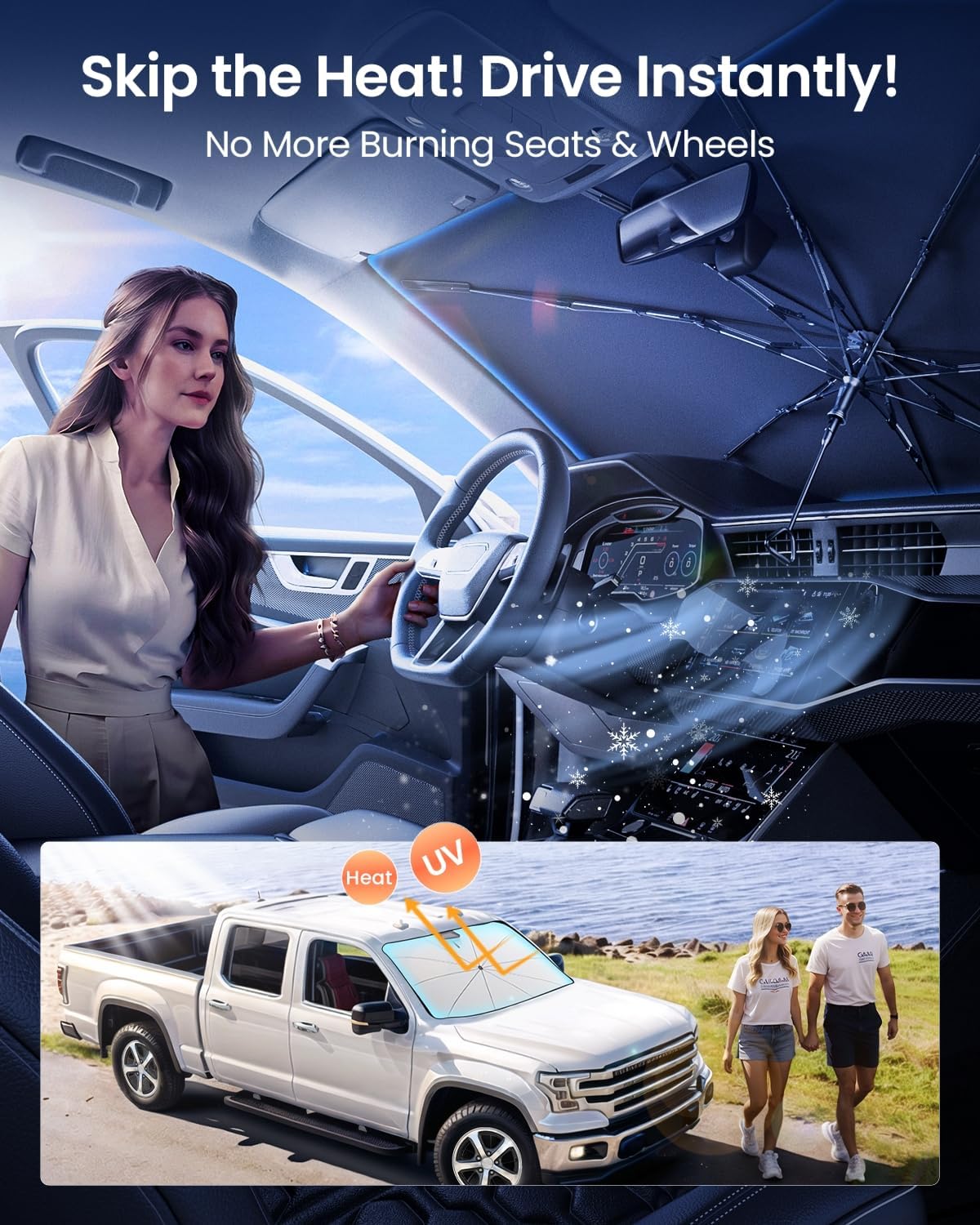 REEVAA 2025 Upgraded Truck Windshield Sun Shade Umbrella [100% Sun Protection & Keep Cool] Protect Interior, 360° Flex Handle Sun Shield Sunshade, Large (61''x35'') for Truck/Full-Size SUV Car