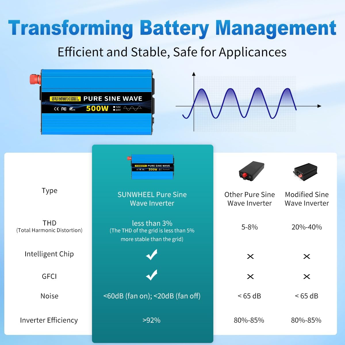SUNWHEEL 500W Pure Sine Wave Inverter, 12V DC to 110V/120V AC Car Power Inverter with 2 AC outlets and LCD Display
