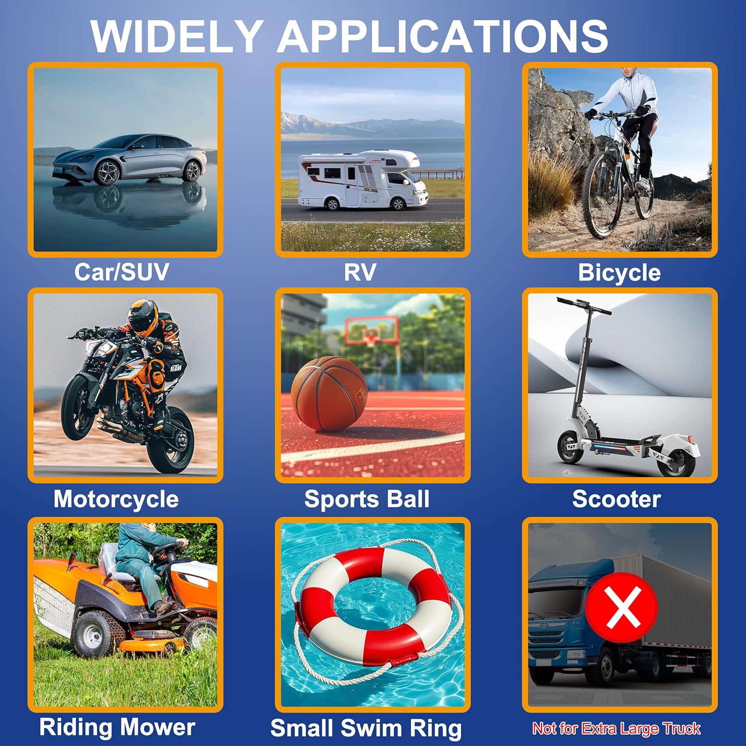 - 【5 Tire Inflator Modes】4 preset modes inflate cars, motorcycles, bikes and balls, and automatically stops when it reaches the preset value. 1 Manual mode allows you to set the pressure value according to the object to be inflated, 3-150PSI. Easy to operate, it can meet a variety of inflation needs, such as car, SUV, pickup, motorcycle, bike, sports balls, small swim rings.