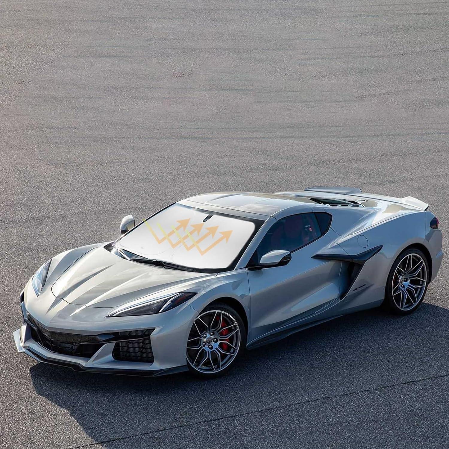 - 【Vehicle Specific】Our Windshield Shade Cover custom fit for Chevrolet Chevy Corvette 2020 2021 2022 2023 2024 2025 2026 Accessories ,Full covered your windshield,No Gap,100% Perfect fit. The precise fit design and reinforced steel ring are sufficient to allow the sun shade to precisely fit the front window without the need for suction cups to hold it in place, effectively protecting your car from the sun's rays.