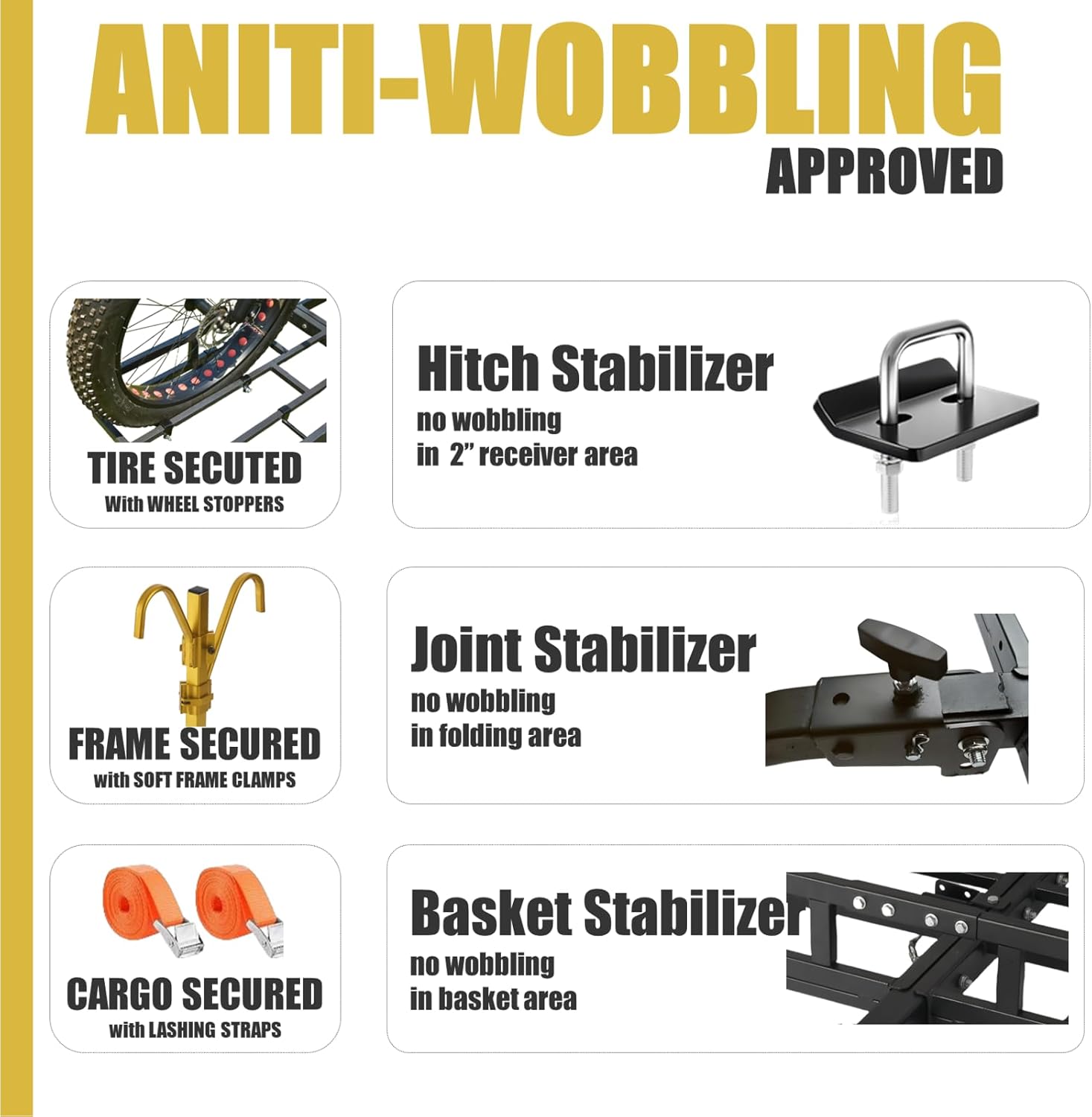 - STURDILY BUILT & EASY USE: Treated to resist rust and corrosion, this hitch cargo bike rack withstands tough weather conditions. The foldable design saves space and makes parking easy when not in use
