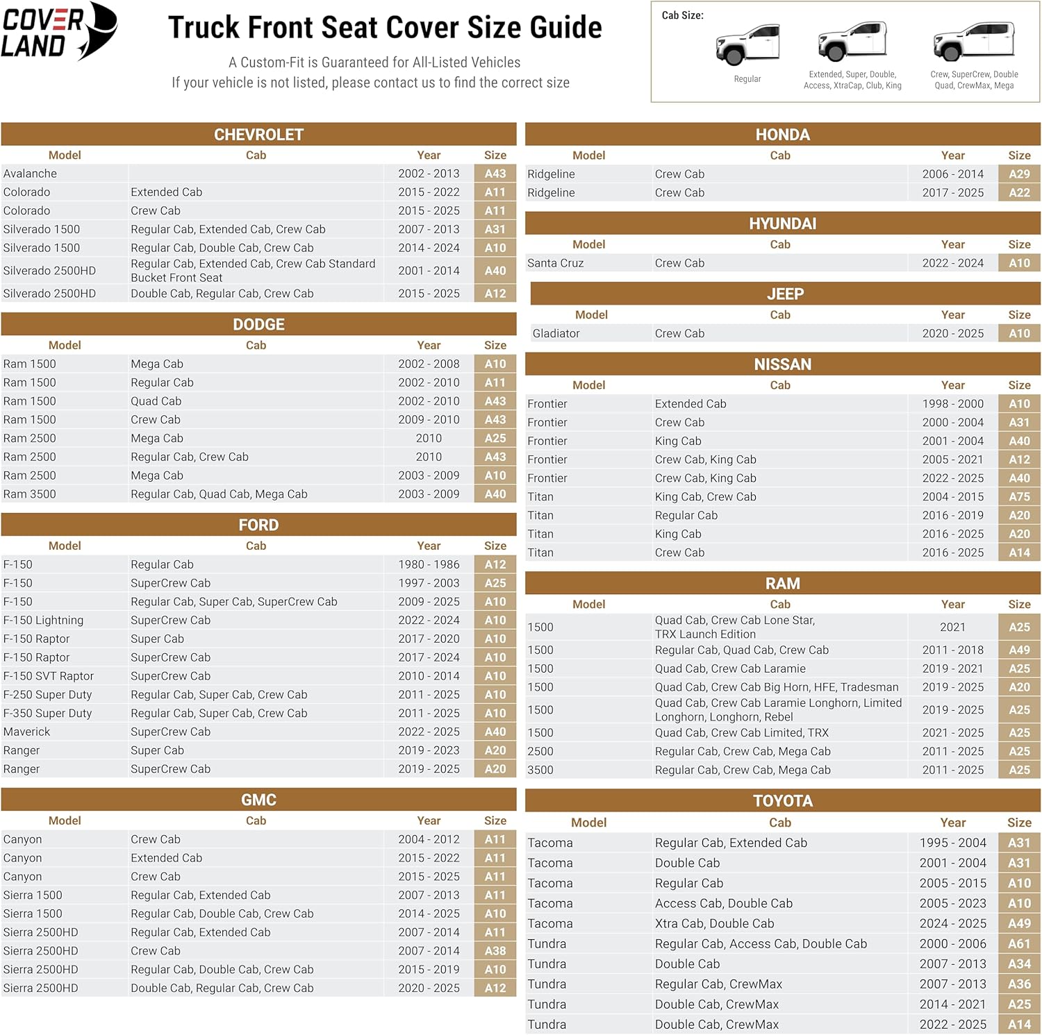 Coverland Custom Car Seat Covers Compatible with F150, Ram 1500 2500 3500, Tundra - Premium Leather Non-Slip Memory Foam Waterproof Interior Protector Front Seat-Beige [See Size Chart-Size A25]