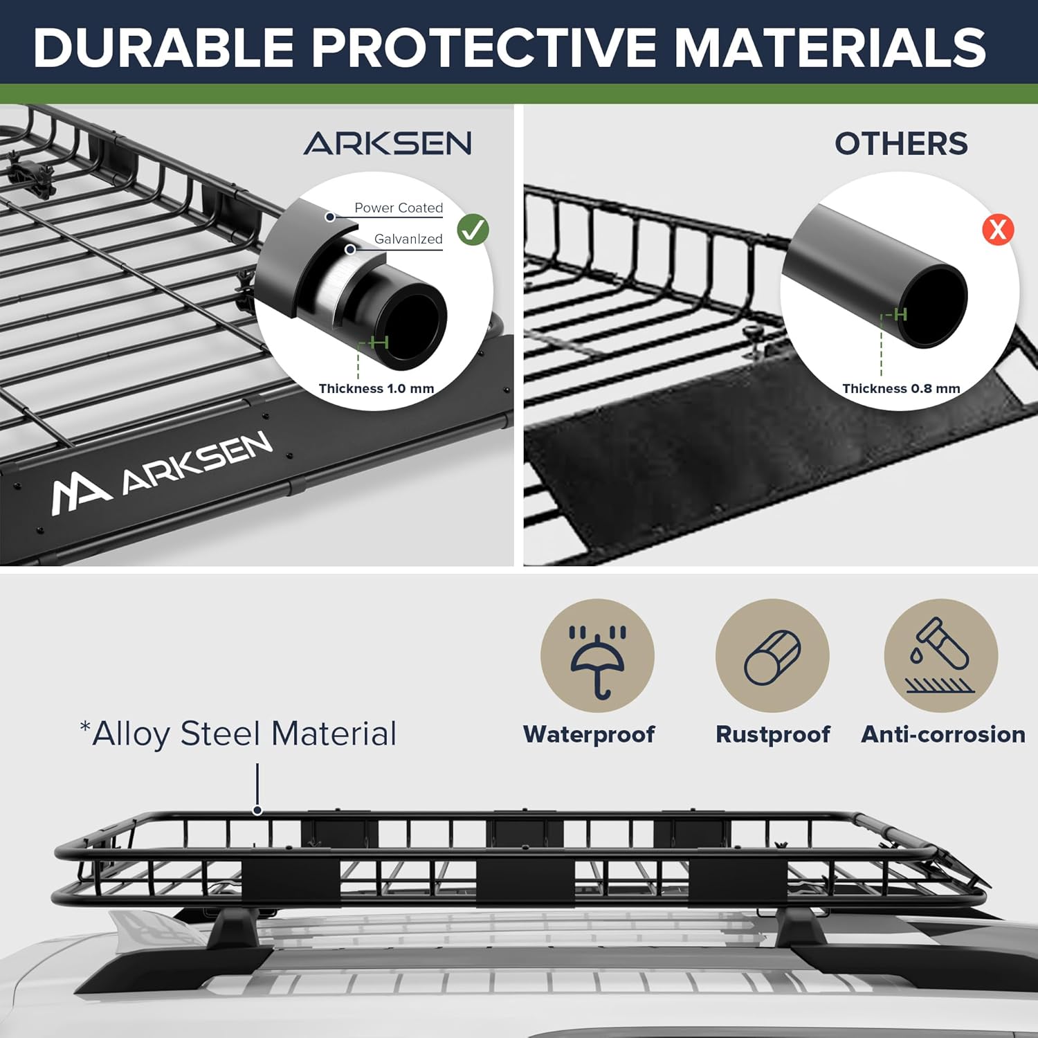 - Heavy Duty Construction: Made from high-strength steel with a 150 lbs capacity, this ARKSEN roof rack features a black powder-coated finish for enhanced corrosion and rust resistance.
