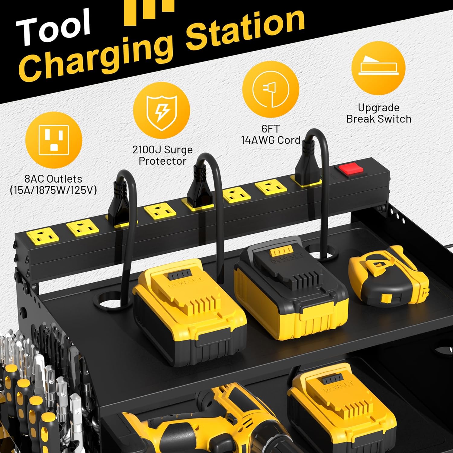 - SAFE CHARGING STATION:8 outlets power strip for power tool organizer solves the power needs,with 125V/15A/1875W,6ft power cord and 2100J surge protection to protect power equipment;Drill holes in single-layer boards to solve power cord clutter problems.