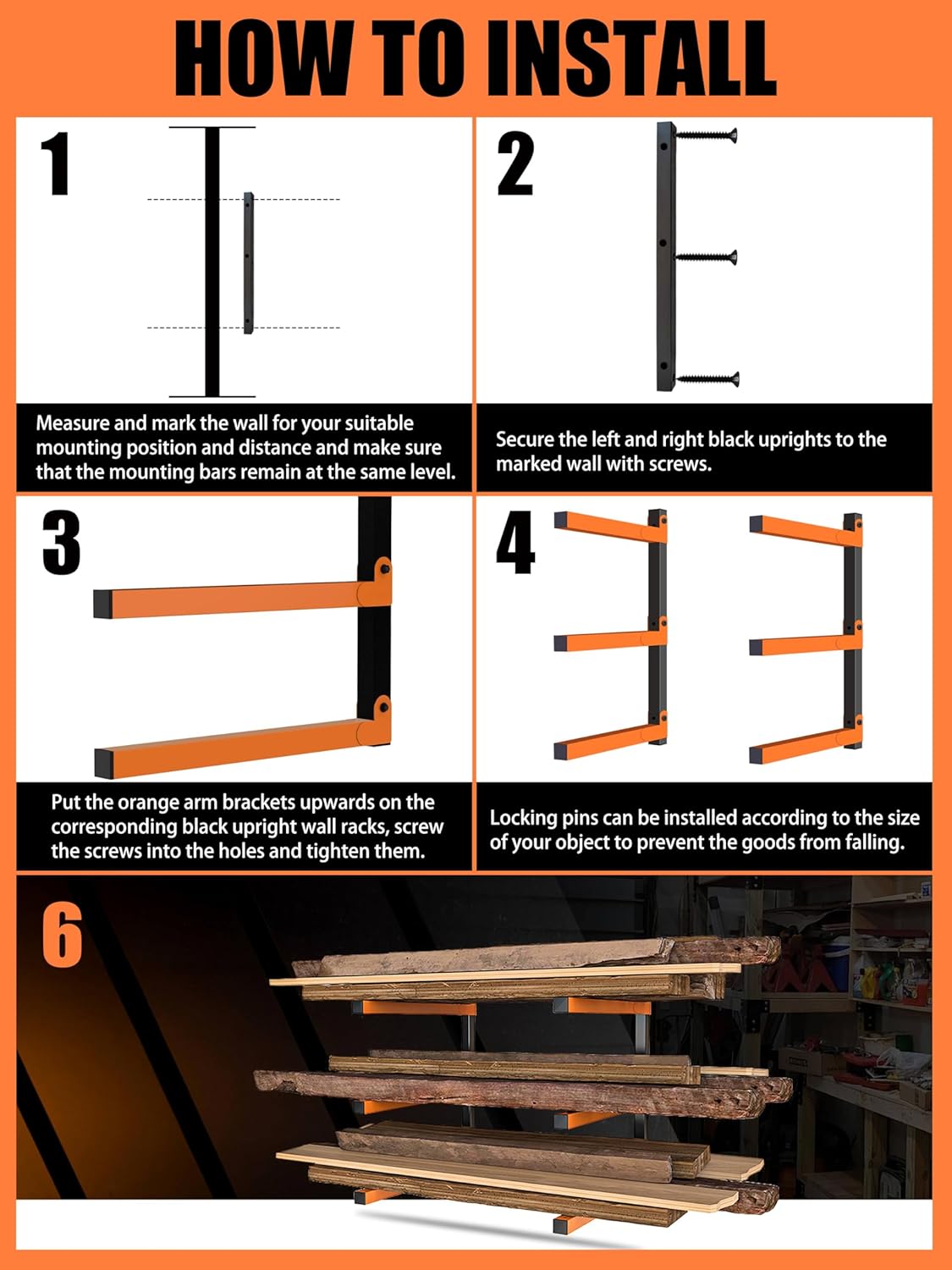 Caliee lumber Storage Rack Wall Mount, Heavy Duty Wood Storage Racks With 6-Level System Holds Up to 1400 lbs, Garage Shelf Wall Mount, Basement, Workshop, Rustproof & Space-Saving Design (4)