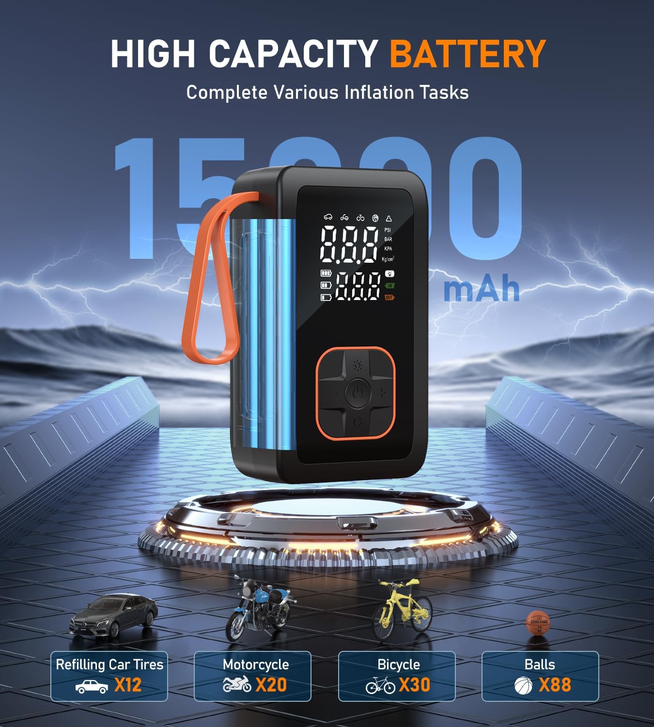 - 【Fast and Safe Inflation】Equipped with an intelligent sensing system, when the tire pressure reaches the preset value, it automatically stops inflating. The safety factor is maximized! The inflation rate soars to 36L/min, three times faster than normal tire inflator portable air compressors, allowing you to complete inflation in a short time