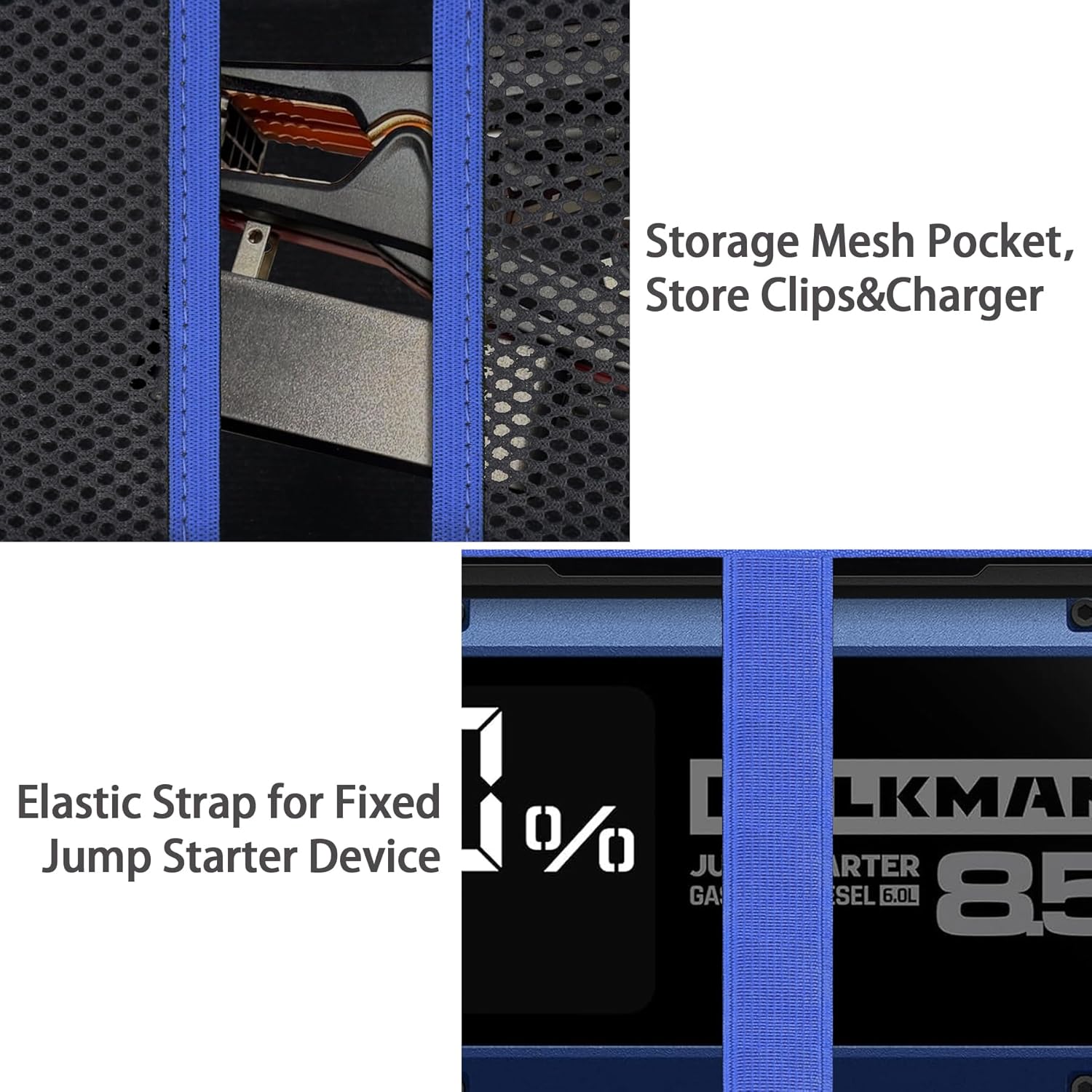 - Reasonable Storage of Jump Starter Accessories:Built-in mesh pocket can store the booster clamps of your hulkman alpha85/85s/pro jump starter, when your booster clamps and alpha85/85s/pro battery starter are put together, you can find it quickly when you need to use it.
