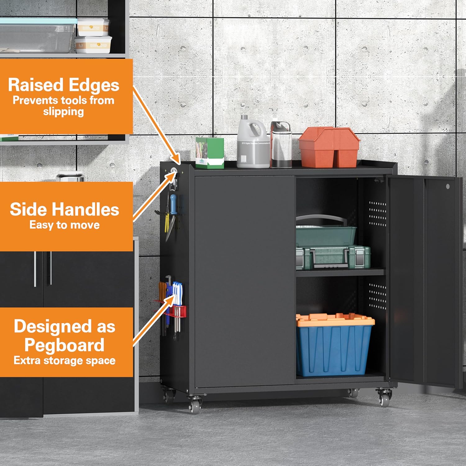 - 🧑🔧【Effortless Mobility and Easy Assembly】With four 360-degree swivel casters that can be locked when not in motion, this garage cabinets with wheels is easy to move around yet stable when needed. The included assembly instructions clearly illustrate each component and step, along with an assembly video for reference, enabling one person to complete the setup in approximately 40 minutes.