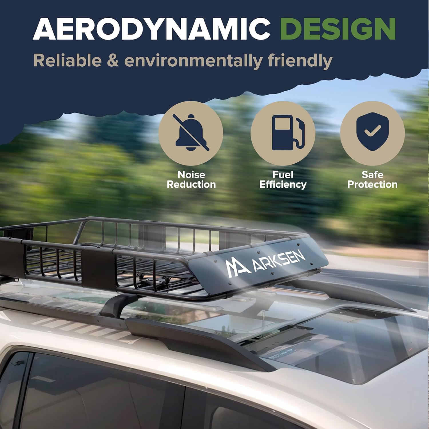 - Aerodynamic Design: The steel wind deflector on this roof rack reduces drag and noise while improving fuel efficiency. Plus, its smooth rounded edges protect both your gear and hands from scratches and injuries during loading/unloading.