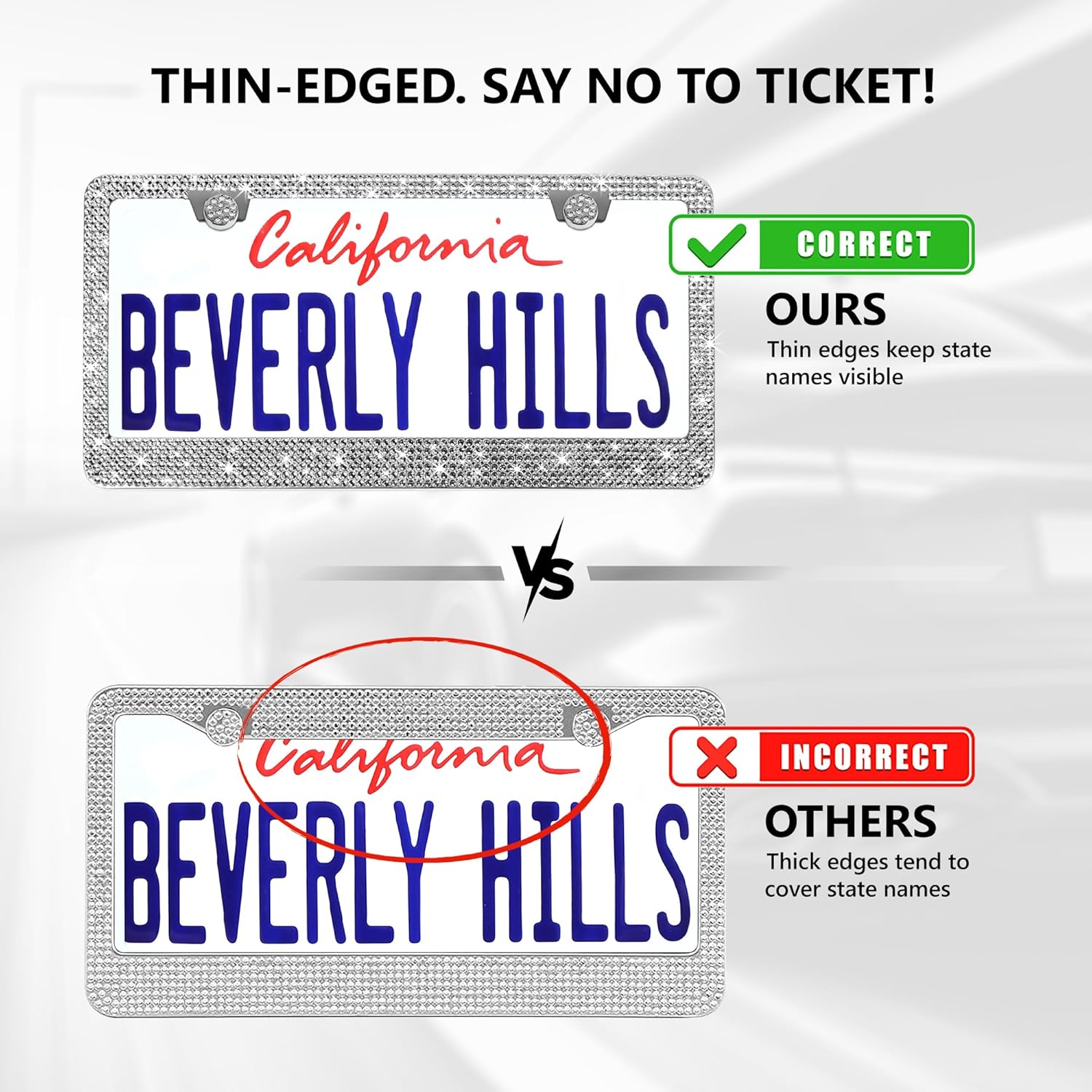 - 100% STREET LEGAL FIT: The dimensions of rhinestone license plate frames are 13.03 x 0.55 x 7.24 in, fitting standard U.S. license plates for all states. These license plate protectors have a rounded arc design and also protects the license plate from bending or deformation.