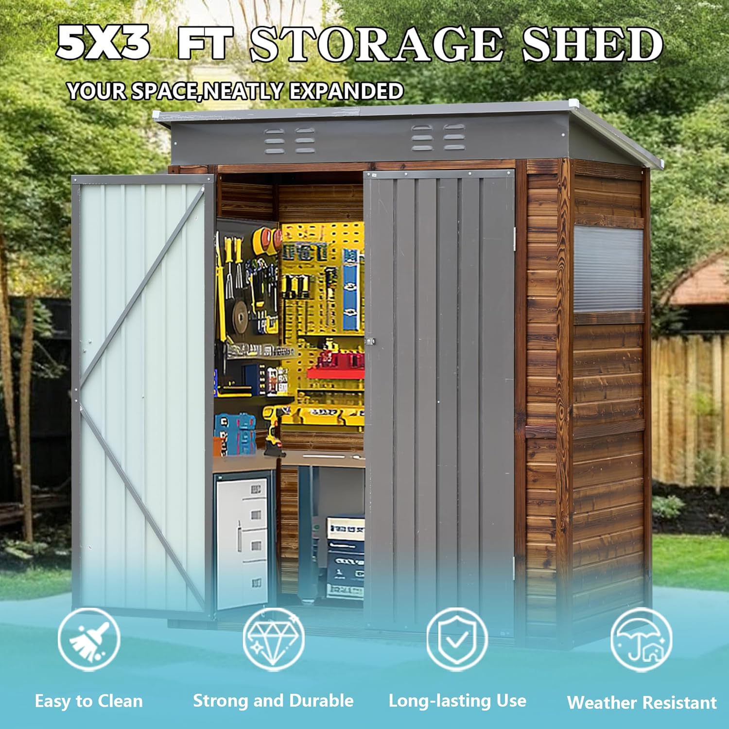 - Stylish and Durable Design: This 5x3 FT Small tool shed combines high-quality cedarwood with a waterproof finish for a natural yet durable look. Dark gray iron doors and roof offer superior weather resistance, making it perfect for outdoor use. A modern touch to your backyard or garden.