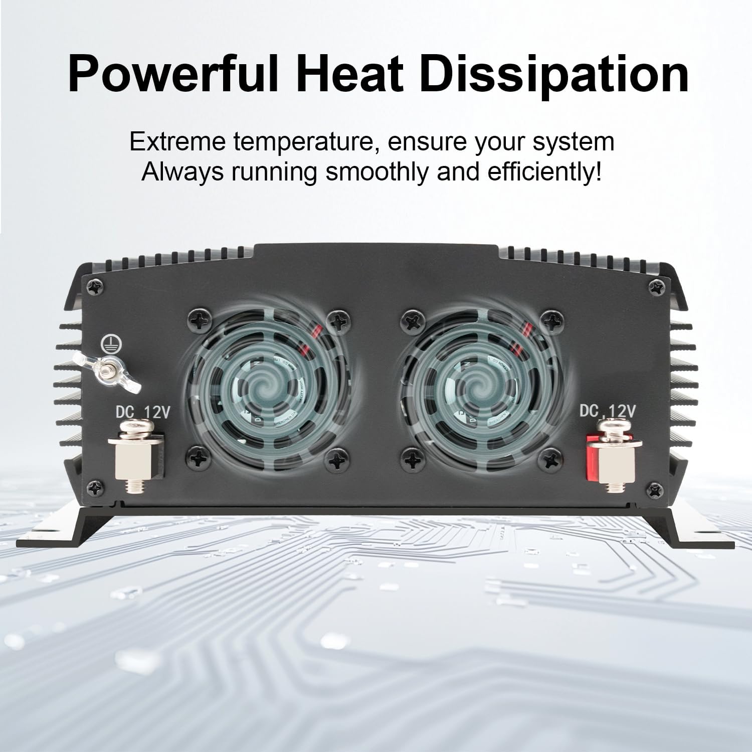 - {Safety protection} This 2000 watt inverter has Multiple protections: overvoltage, undervoltage, overload, short circuit, overheating and soft start technology. Equipped with dual cooling fans, excellent heat dissipation performance. Ensure your safety during use and extend the service life of the inverter.