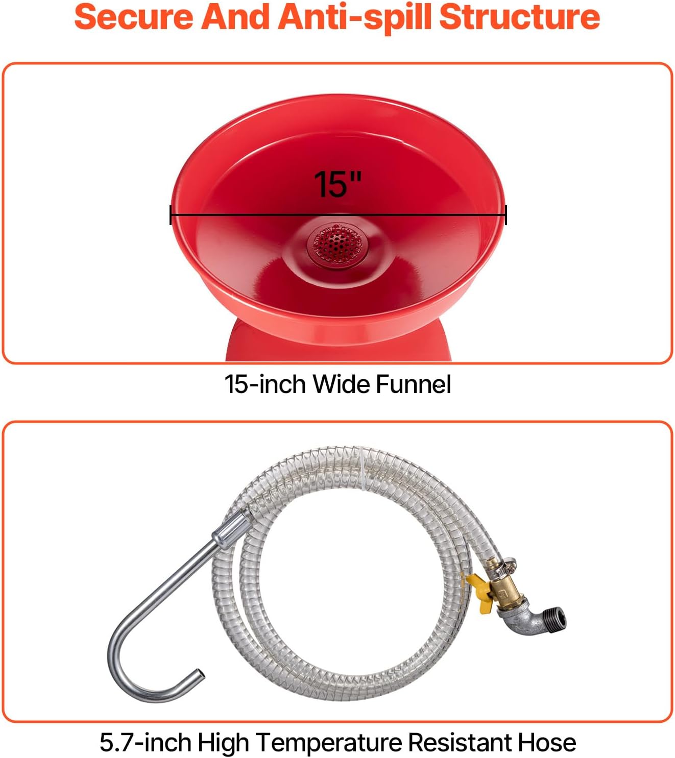 - Anti-leakage Design: Equipped with a 15-inch ultra-wide splash-proof funnel, the oil recovery efficiency is improved simultaneously. Equipped with a 5ft and 9inch high-temperature resistant reinforced oil pipe (withstands 120°C continuous working temperature), it effectively prevents overflow and leakage, ensuring security and reducing the cleaning burden