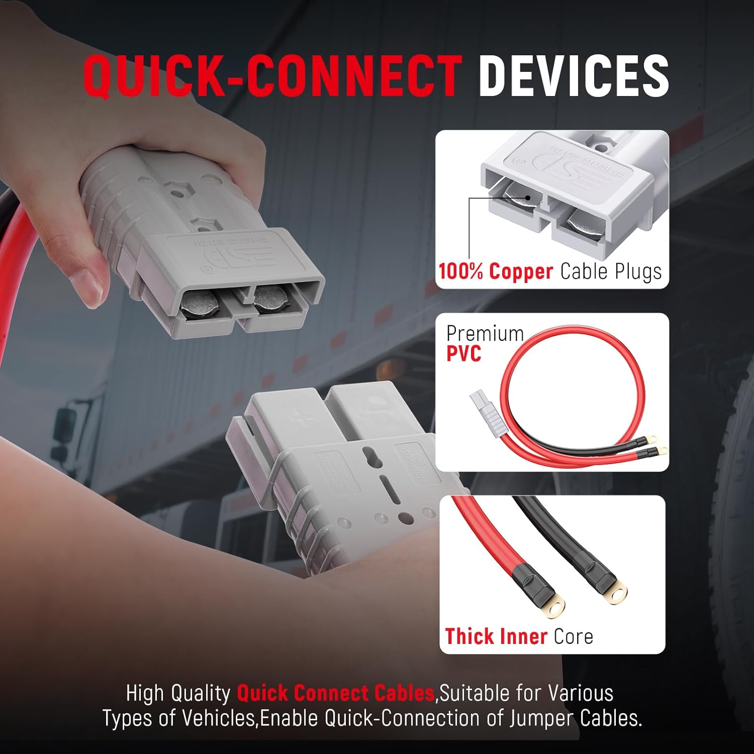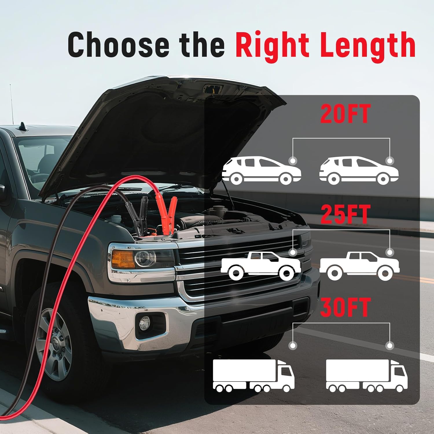 - Effortless Quick-Connect Plug System – Features a 25FT + 5FT heavy-duty jumper cable setup. The short 5FT end stays permanently installed on your car, truck, or SUV battery, eliminating repeated disassembly. Simply plug and start—no hassle, no loose cables, just instant jump-start power whenever you need it!