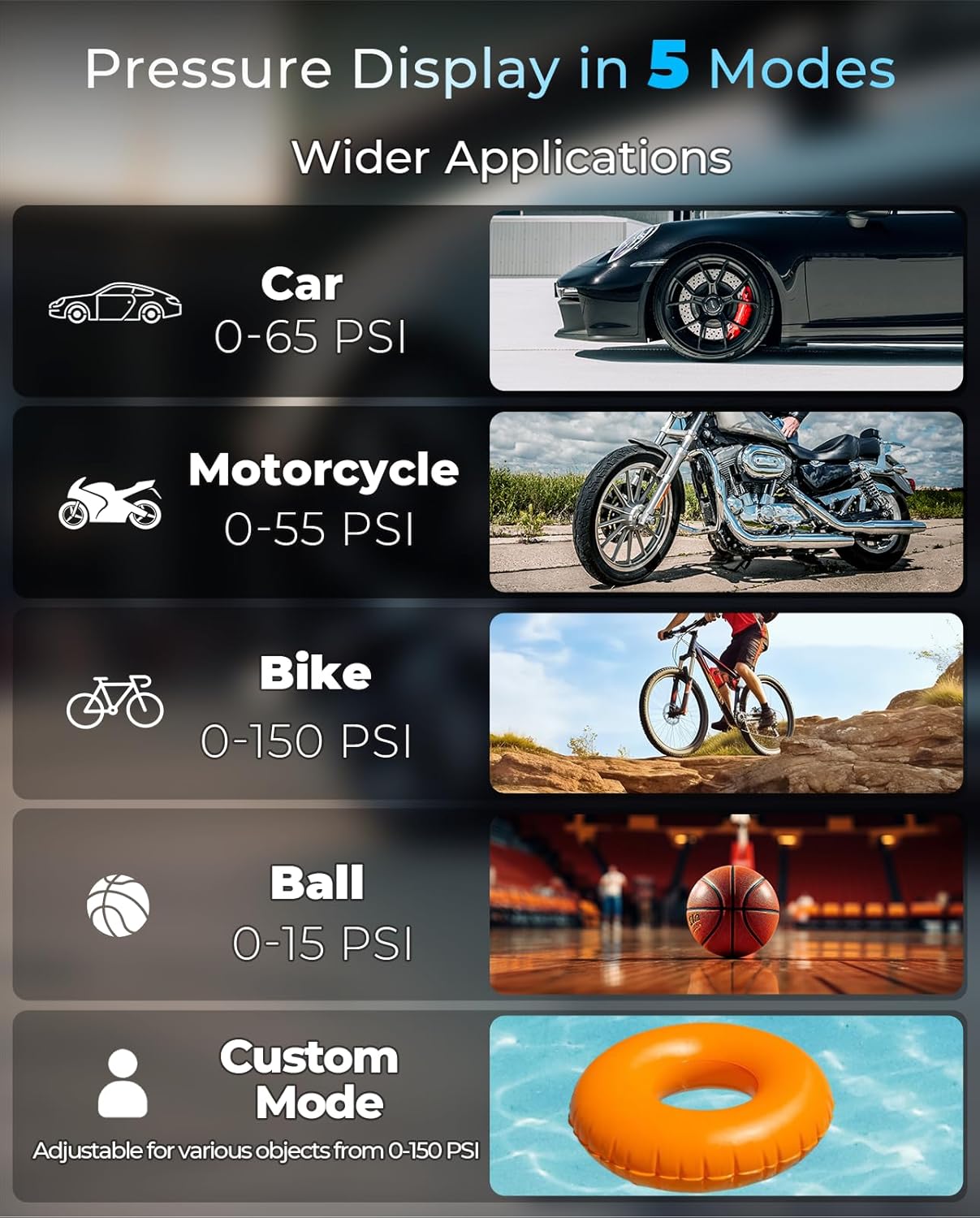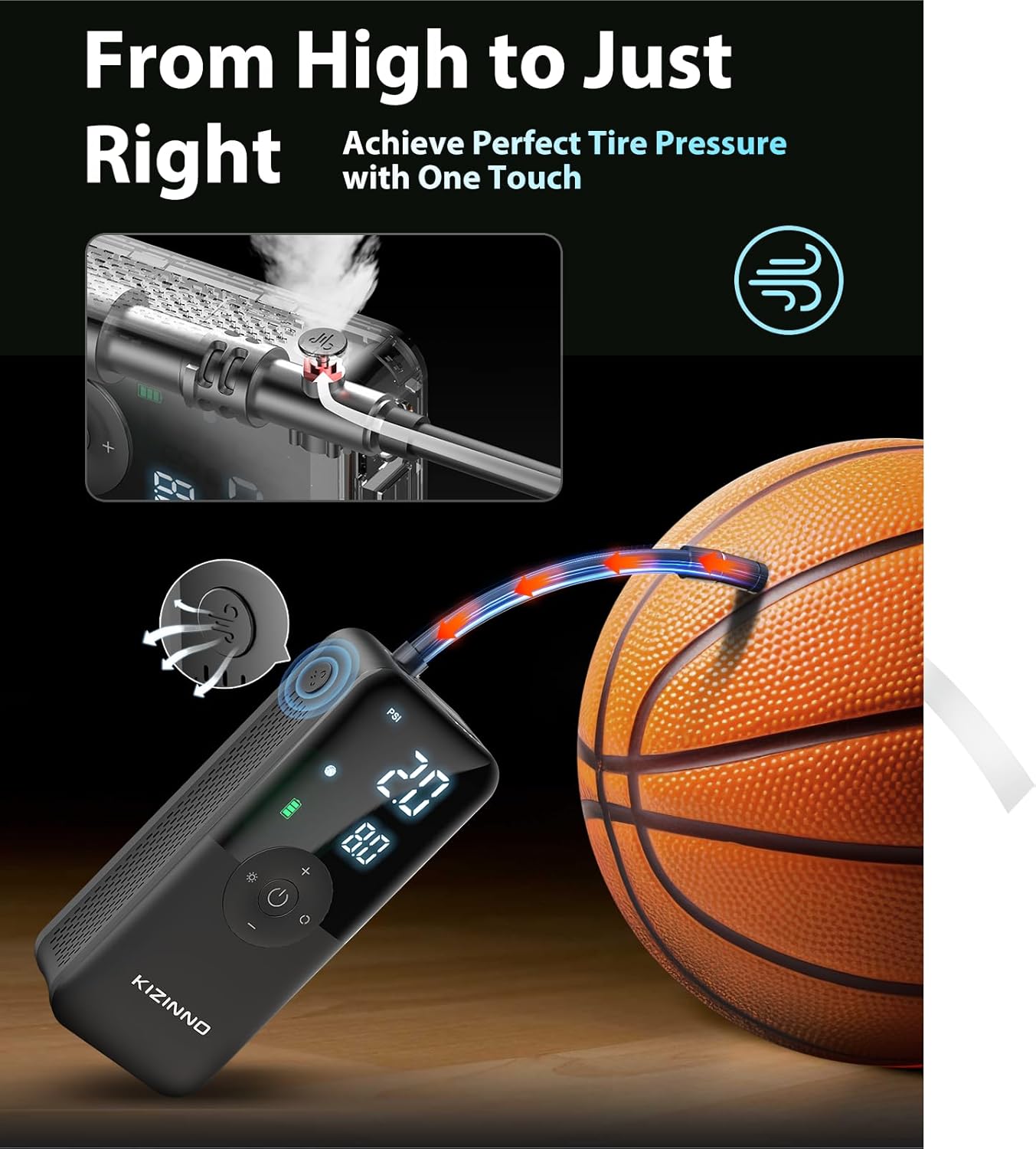 - Smart, Safe, and Versatile - The portable air compressor features intelligent auto-off inflation and a dual-screen display, allowing you to preset pressure and monitor it accurately while preventing over-inflation. It also serves as an emergency tool with an LED light for nighttime use and USB ports for charging devices