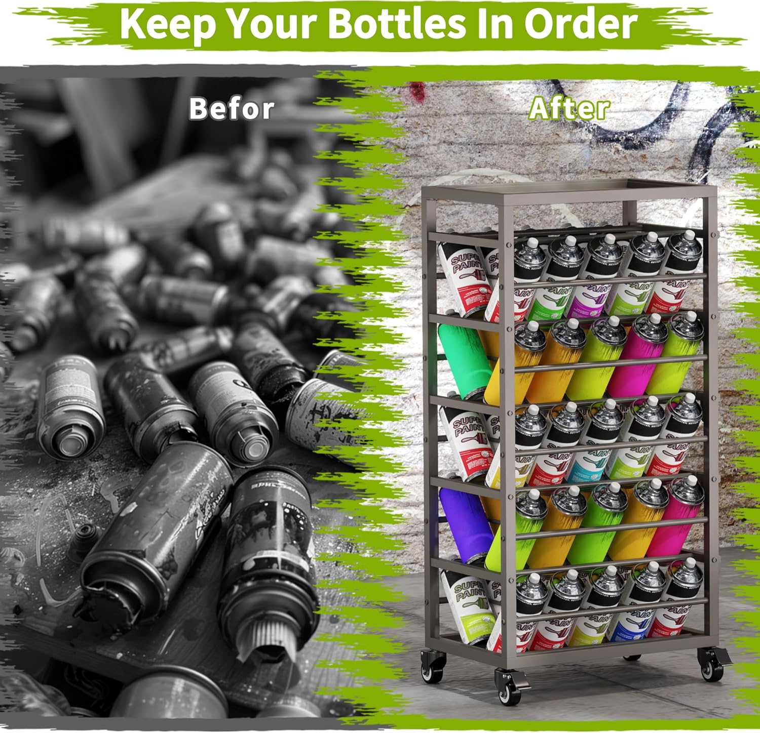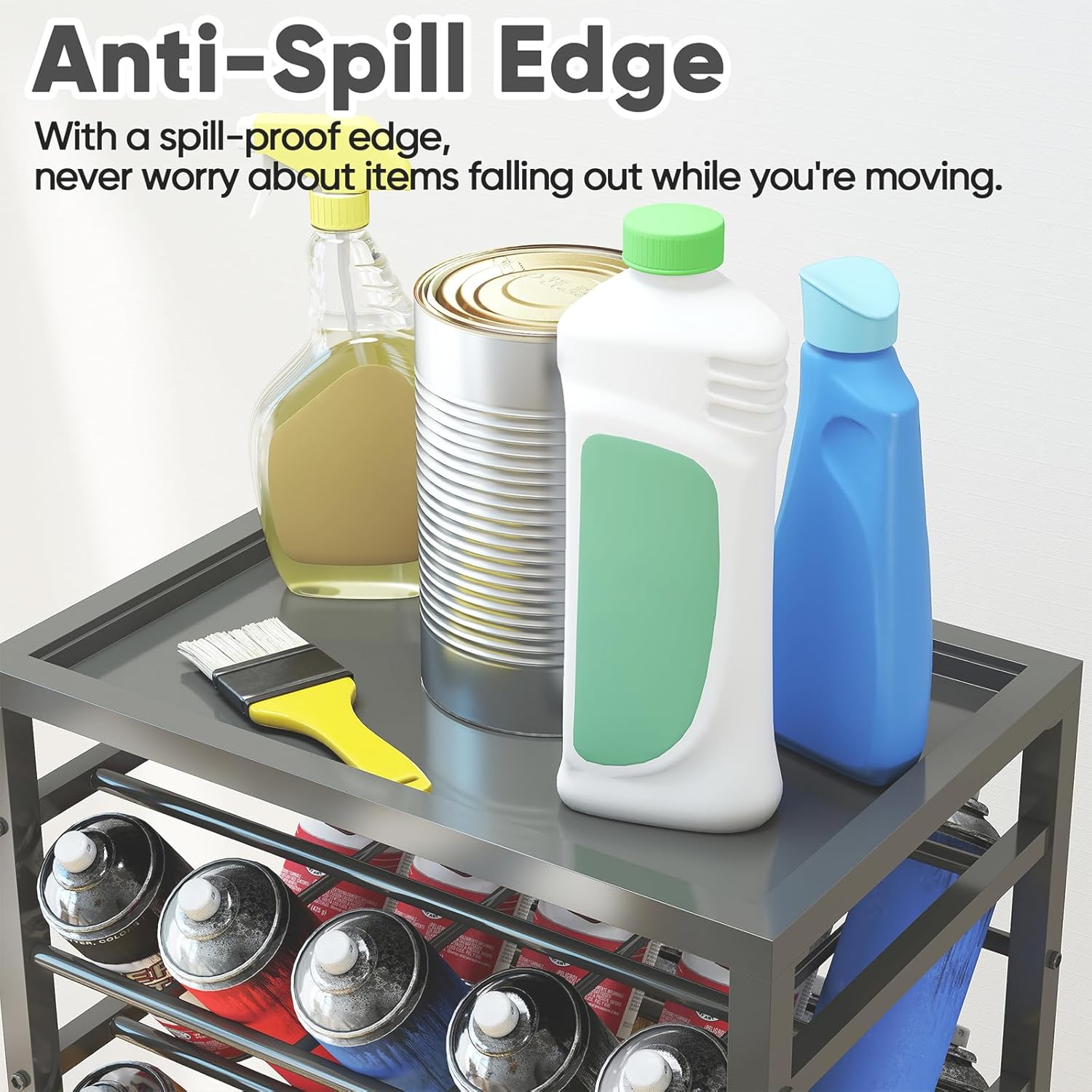 - MOVABLE SPRAY CAN RACK: The spray can organizer cart is equipped with 4 universal casters for easy movement to where you need it, keeping your aerosol cans within reach. Two are lockable to hold the cart in place while you work
