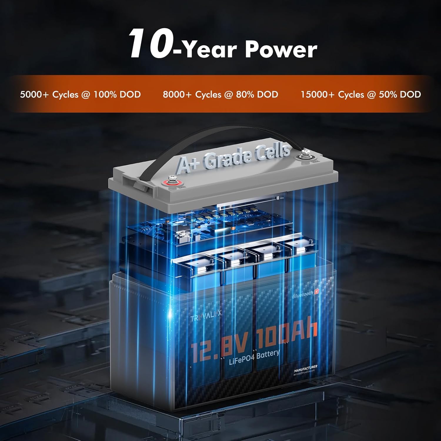 - 【PERFECT LEAD-ACID REPLACEMENT】The TRUVALUX 12 volt 100Ah lithium battery uses premium Grade A LiFePO4 cells for higher energy density and stronger power output. It delivers over 5,000 deep cycles at full capacity and lasts more than 10 years—far outperforming traditional lead-acid, sealed, or flooded batteries, which typically last only 3 years with just 200–500 cycles. With TRUVALUX, you’re not just upgrading your power — you’re saving money in the long run