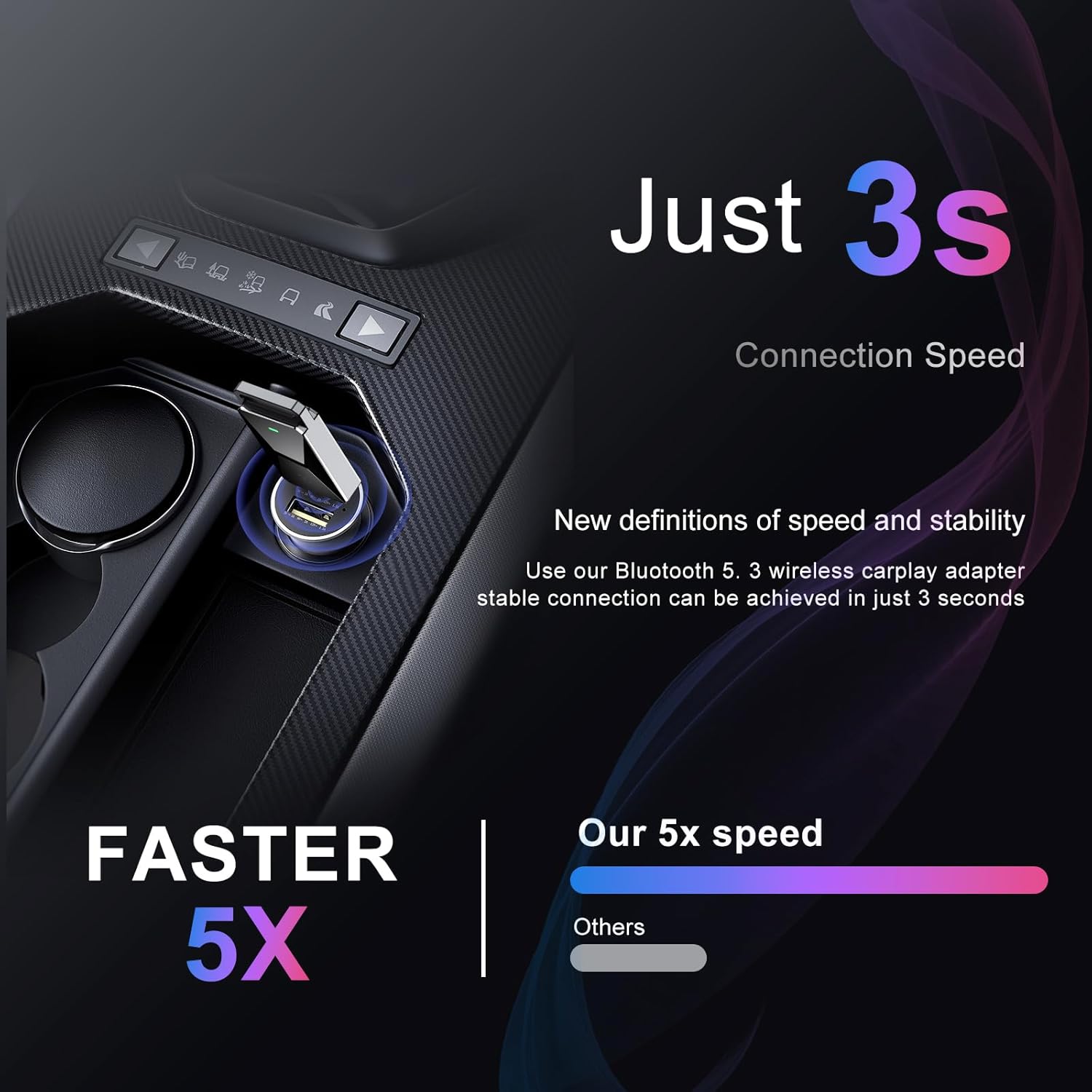 - 🚙【Ultra-Fast Wireless Connection】: Our wireless apple carplay adapter equipped with the latest 5.8 GHz WiFi, Bluetooth 5.3, and a next-gen chip. Complete the first connection in 10s and auto-connect in 3s with zero daily usage delay. Experience transmission speeds 3 times faster than other adapters. Navigate, play music, take calls, and handle messages easily through Siri, touchscreen, buttons, or knobs, making focused driving truly achievable.