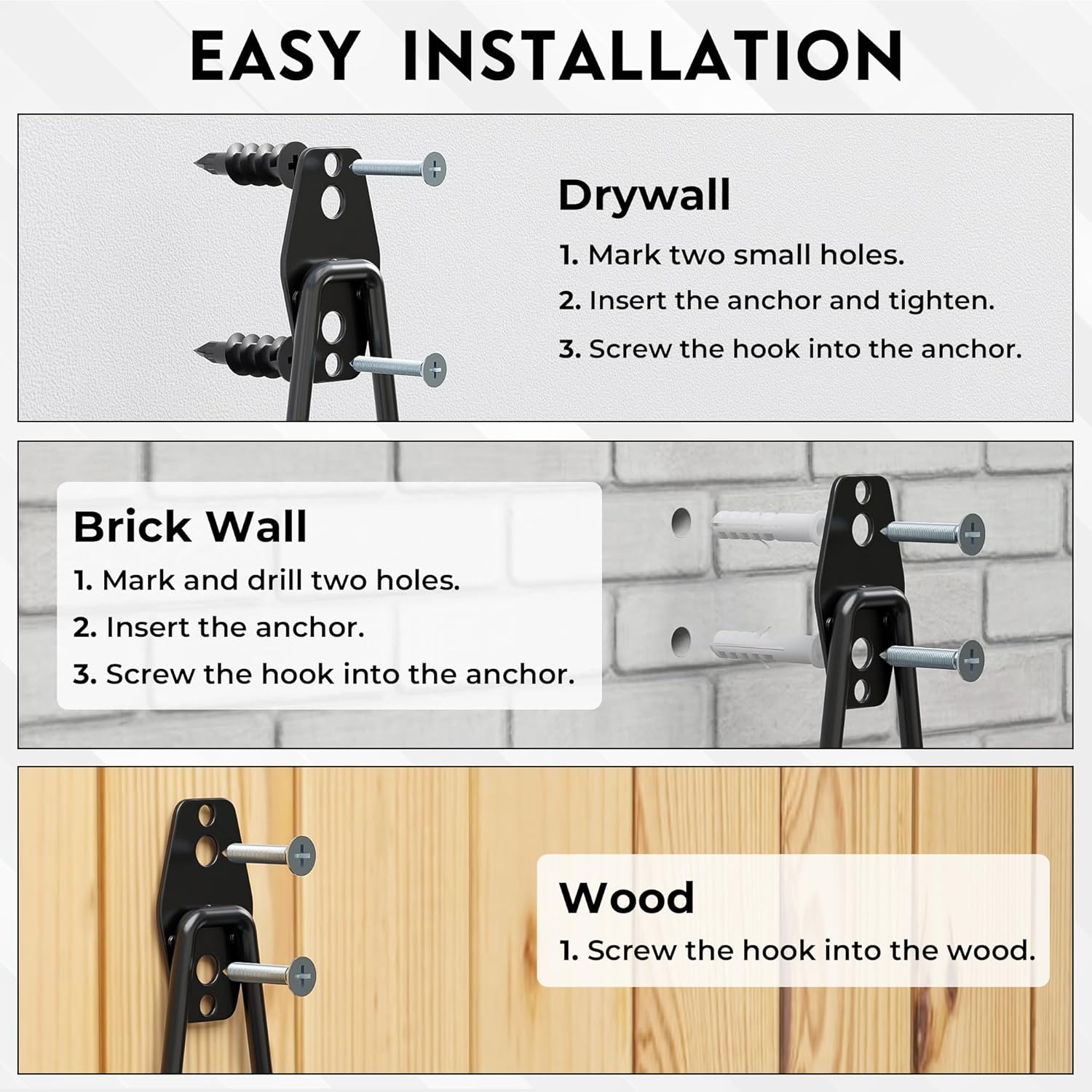 - ✅ EASY TO INSTALL WITH MULTIPLE SCREW TYPES – These hooks come with 24+1 sets of expansion screws, including two types suitable for drywall, wood, and brick walls. In addition to the screws provided for each hook, each type includes an extra set, ensuring backup and error margin during installation
