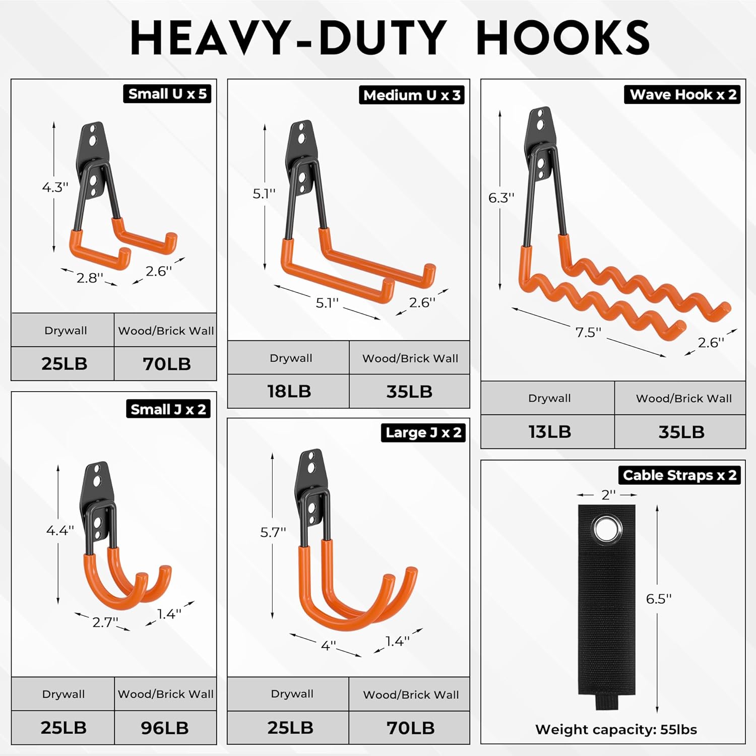 - ✅ MULTIPLE SIZES AND ACCESSORIES - This 16-piece set includes 14 hooks with 5 different sizes (5 Small U hooks, 3 Medium U hooks, 2 Small J hooks, 2 Large J hooks, 2 Wave hooks) and 2 extension straps, offering adaptable storage for bikes, ladders, hoses, tools, and more, perfect for organizing all your garage essentials