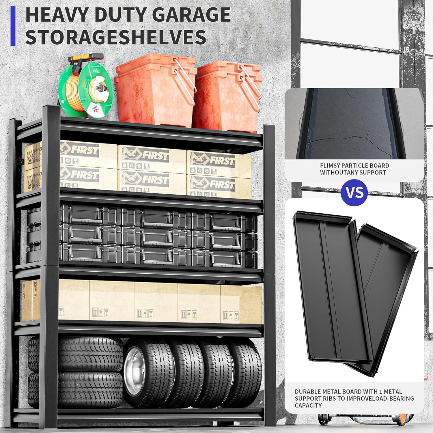 - 👉 EXTRA LARGE SIZE, SPACIOUS SPACE: The extra wide design of this garage shelf provides plenty of storage space, perfect for your storage needs whether it's in your garage, warehouse or basement.